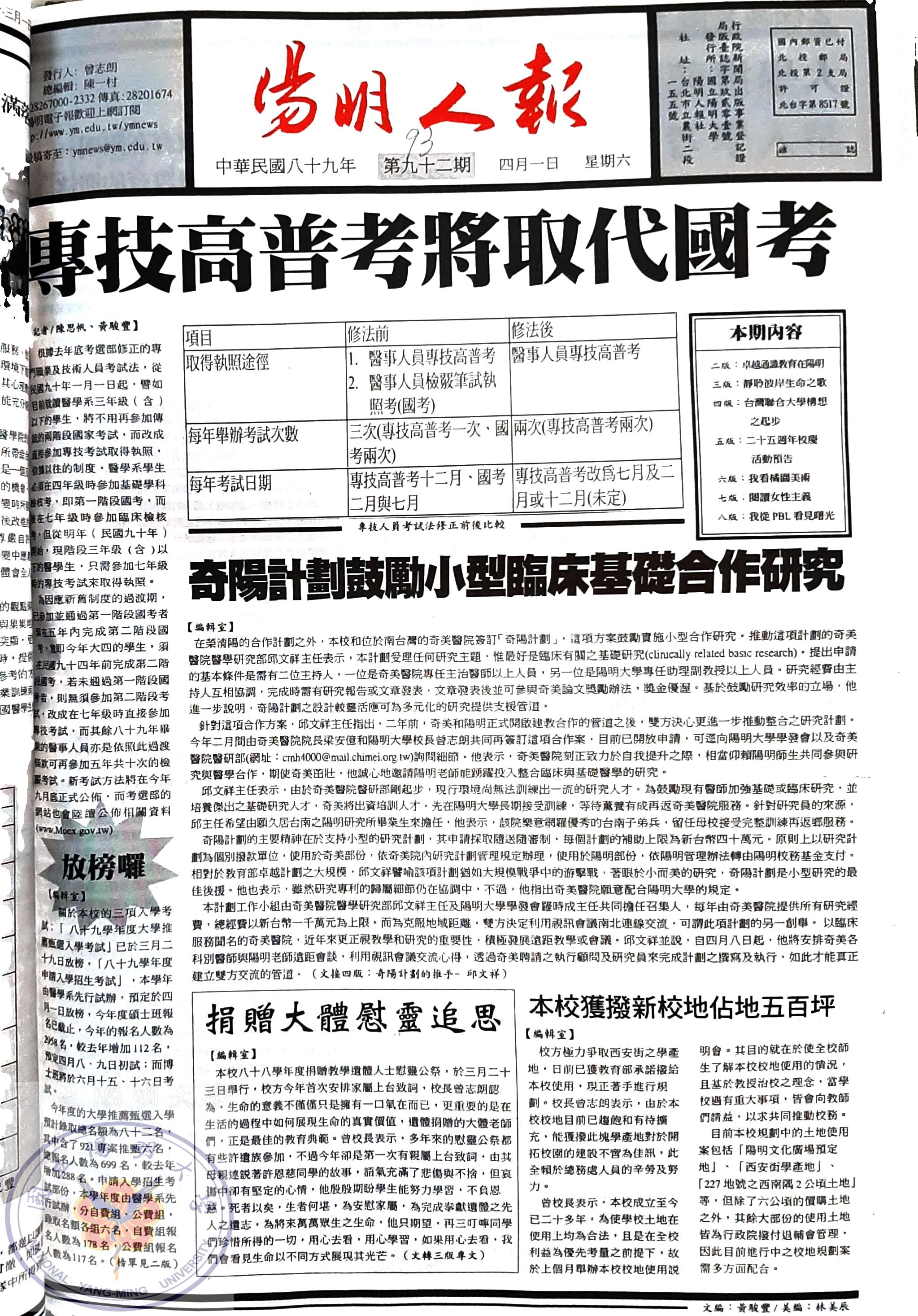陽明人報 第九十二期,內容含:奇美醫院與本校簽訂合作計劃;本校新設四博碩士班;教育部通識教育評鑑「..