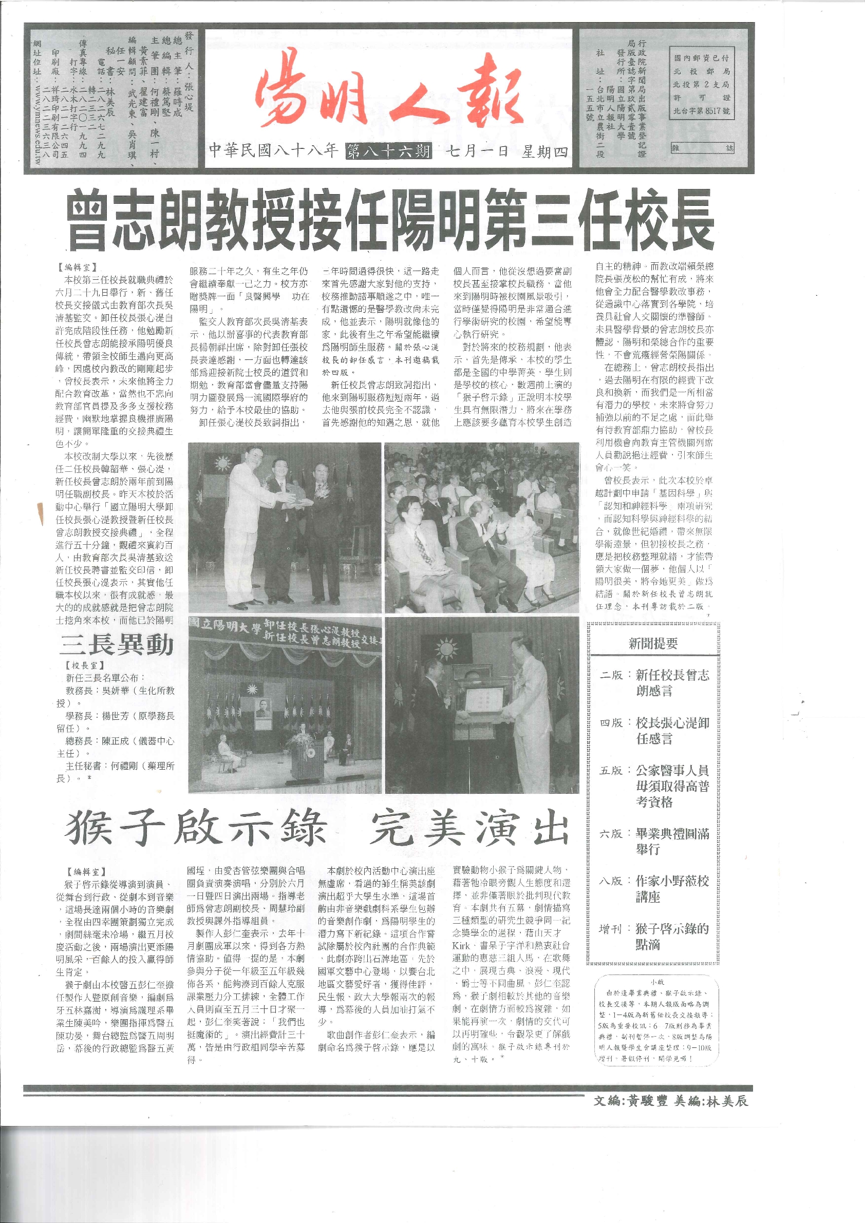 陽明人報 第八十六期,內容含:新舊校長交接與專訪;健康運動中心成立;新學期選課採名額分配 電話語音..