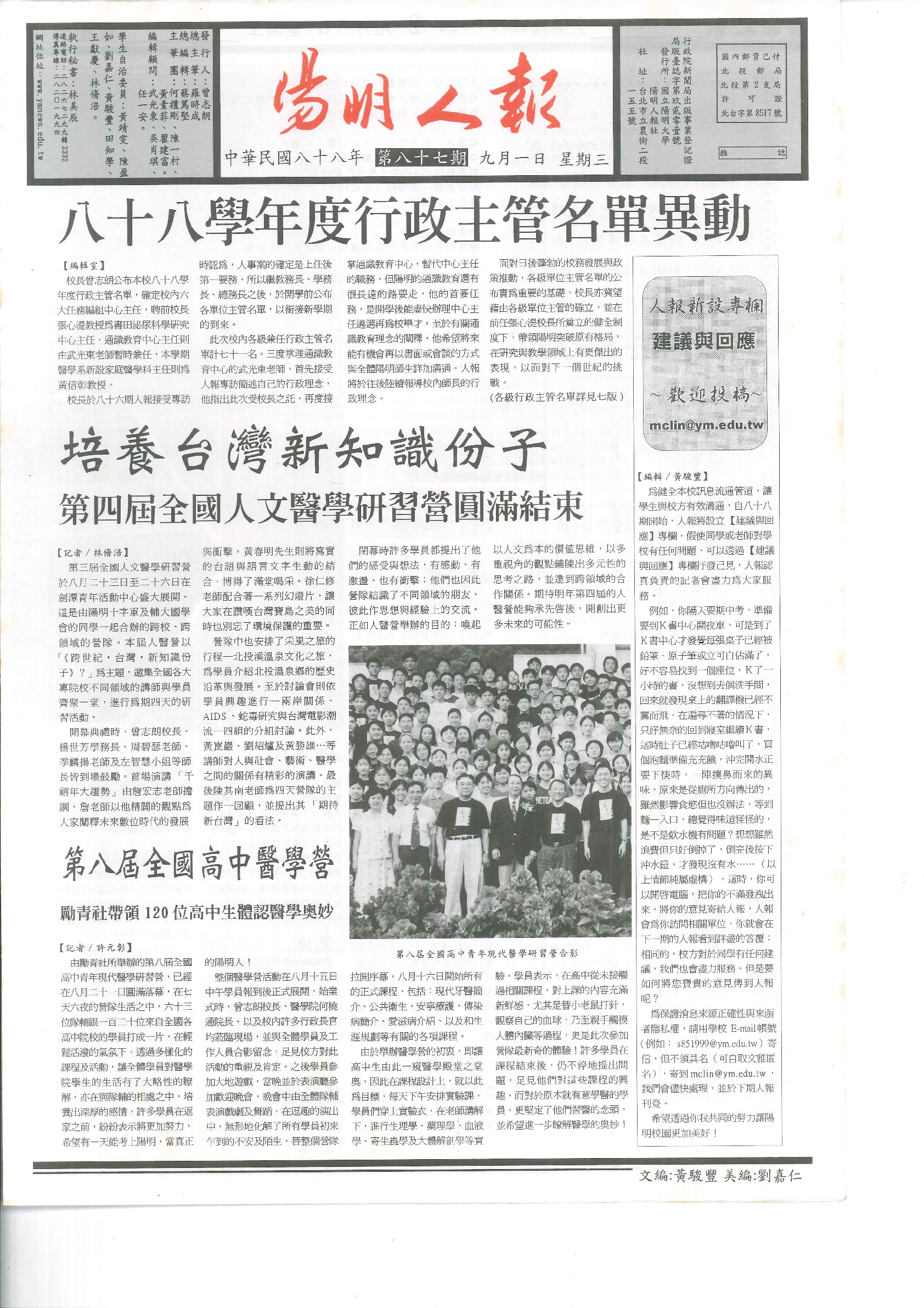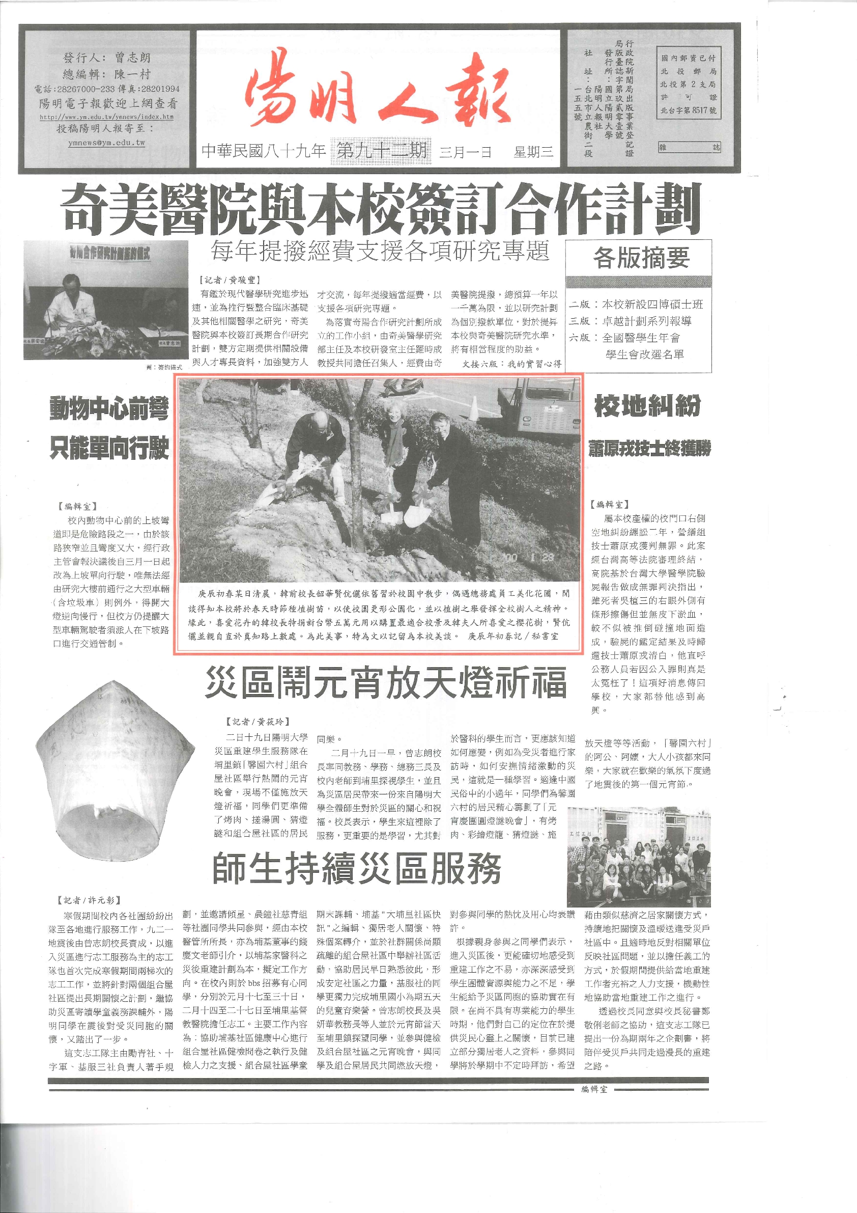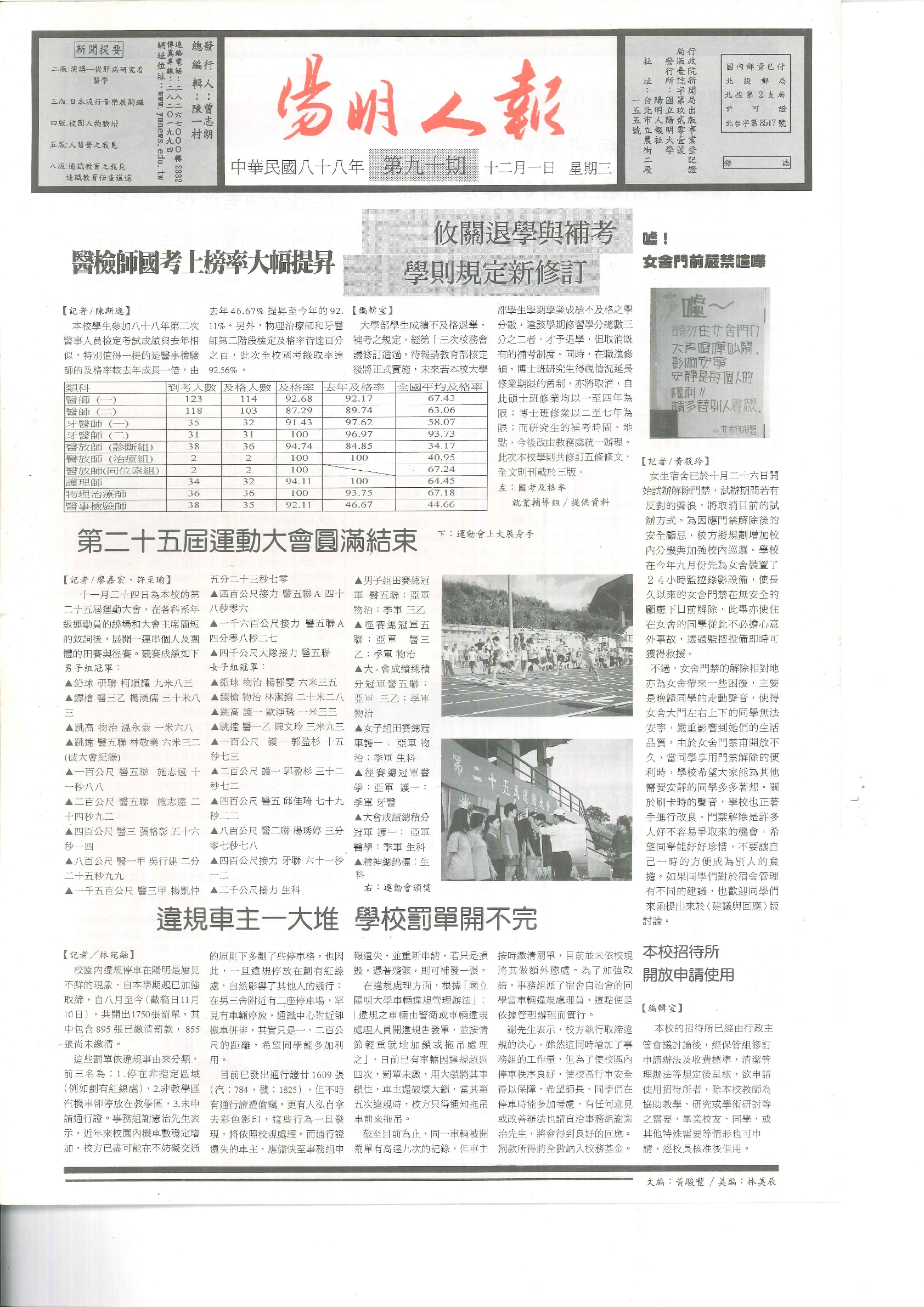 陽明人報 第八十八期,內容含:三項措施協助921救災行動;總機改號;校車改路線;醫技系慶生二十年;..