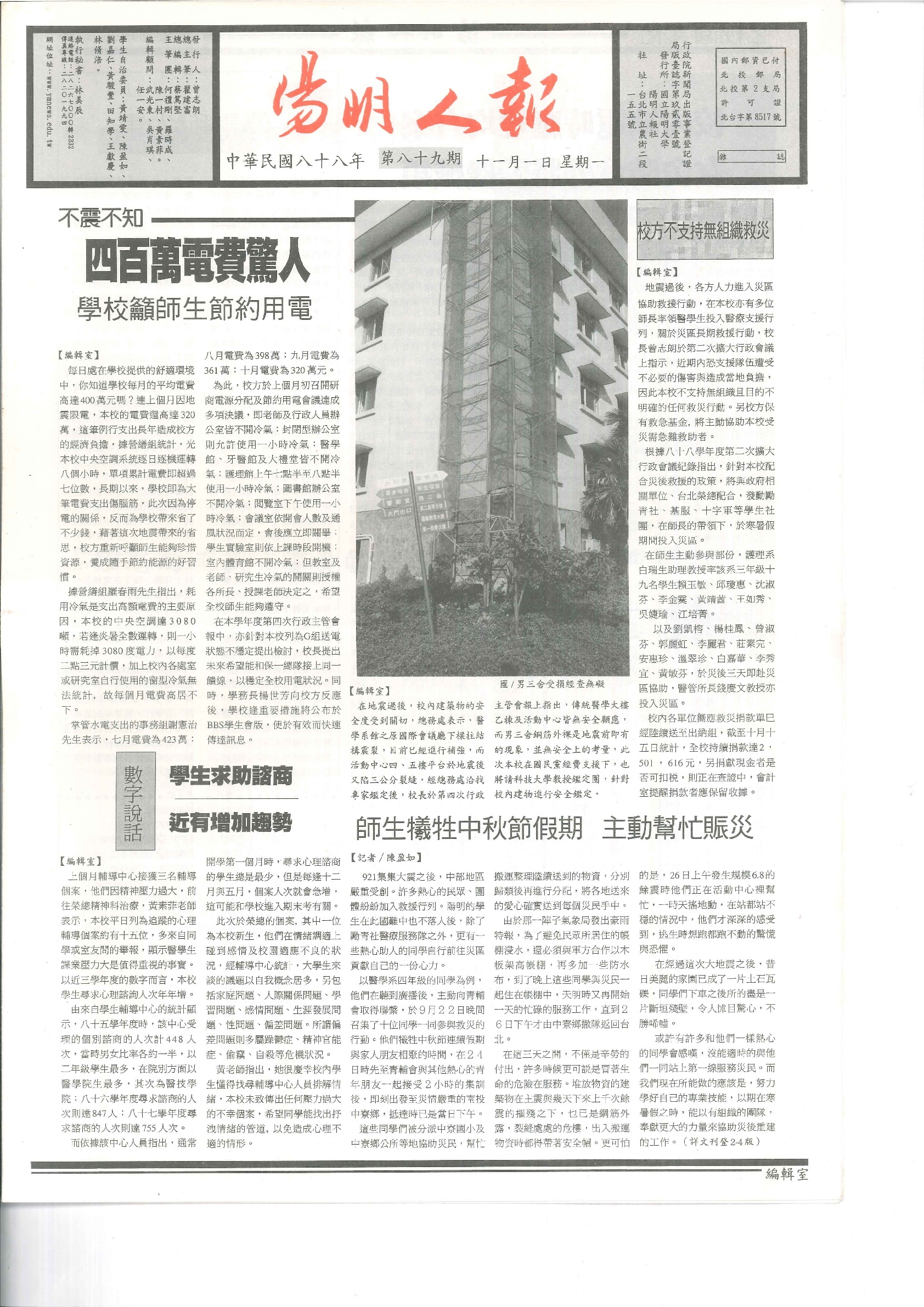 陽明人報 第八十九期,內容含:學校籲師生節約用電;校方不支持無組織救災;學生求助諮商近有增加趨勢;..