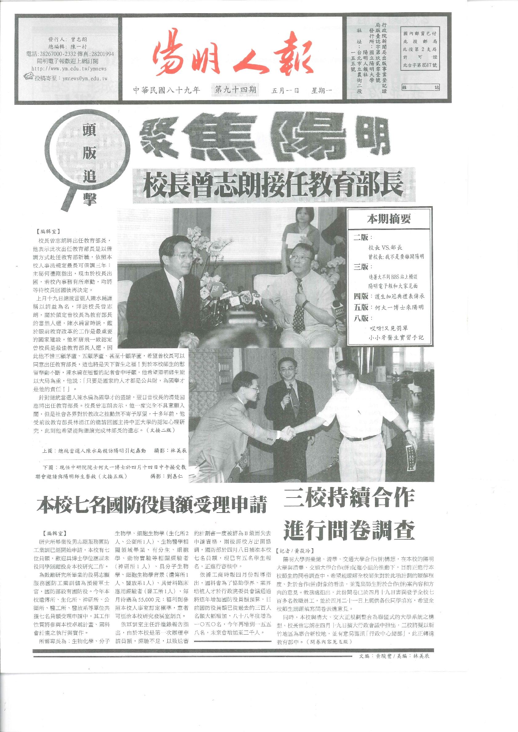 陽明人報 第九十四期,內容含:陽明電子報受理訂閱中;校車減四個班次;陽明大學與榮總 清華 交通大學..