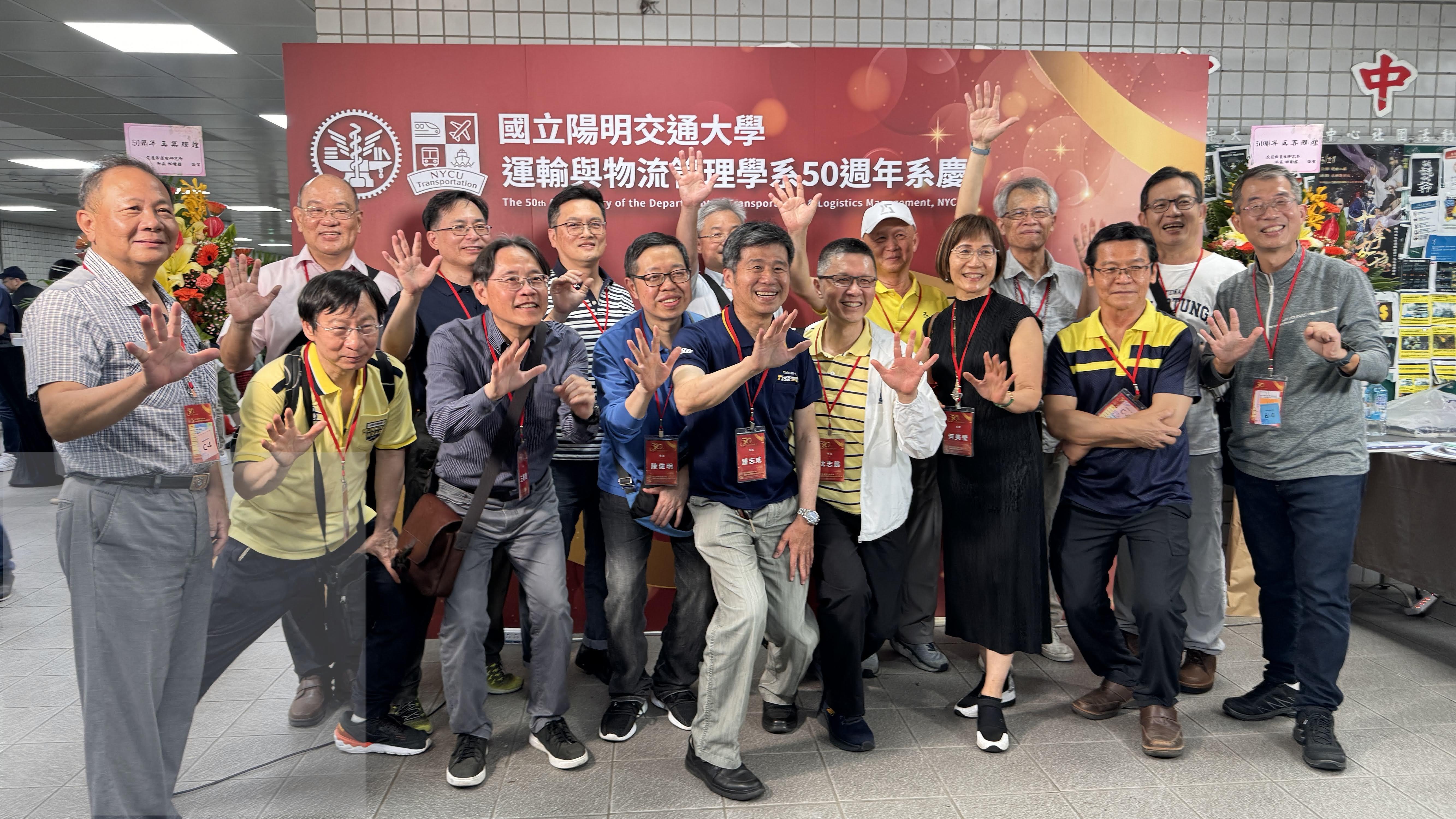 國立陽明交通大學運輸與物流管理學系50週年系慶活動照片,系友陳俊明(前排左4)、鍾志成(前排左5)..