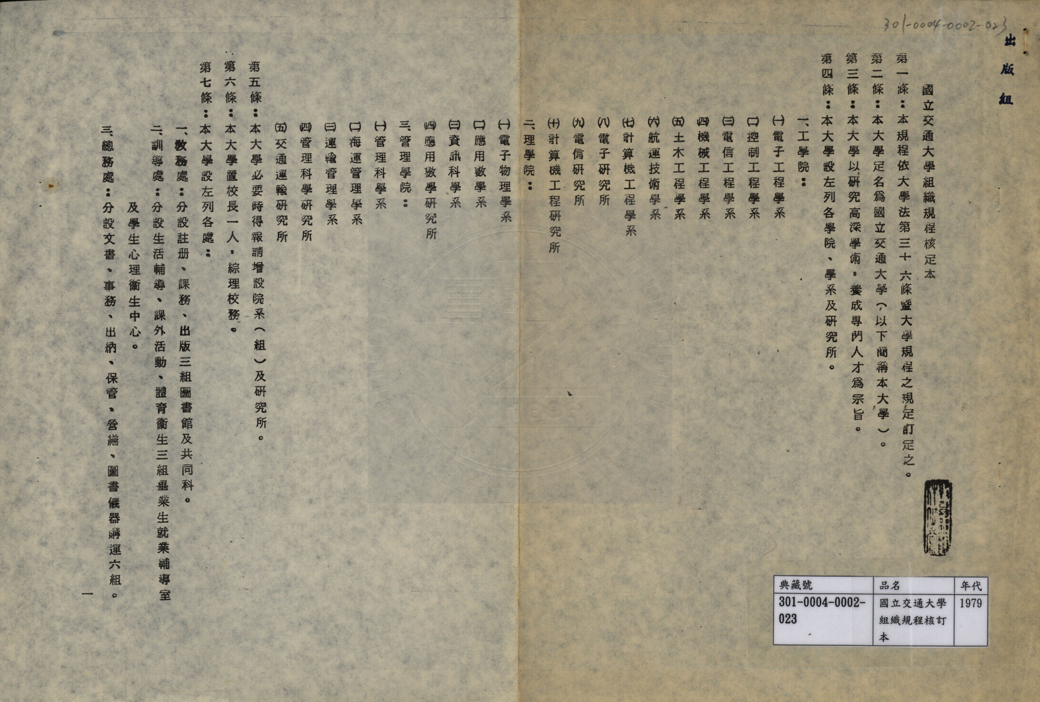 教育部 (函) 國立交通大學工學院-該院自六十八年七月份開始,改名為「國立交通大學」。台(68)高..