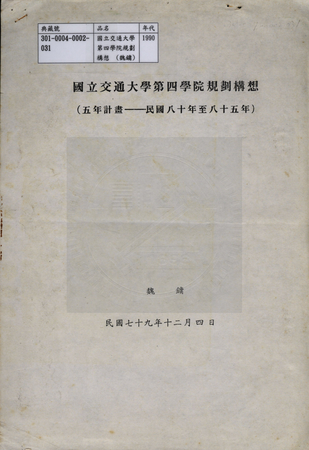 國立交通大學第四學院規劃構想 (五年計畫-民國八十年至八十五年)。說明:為整合交大現有之人文、社會..