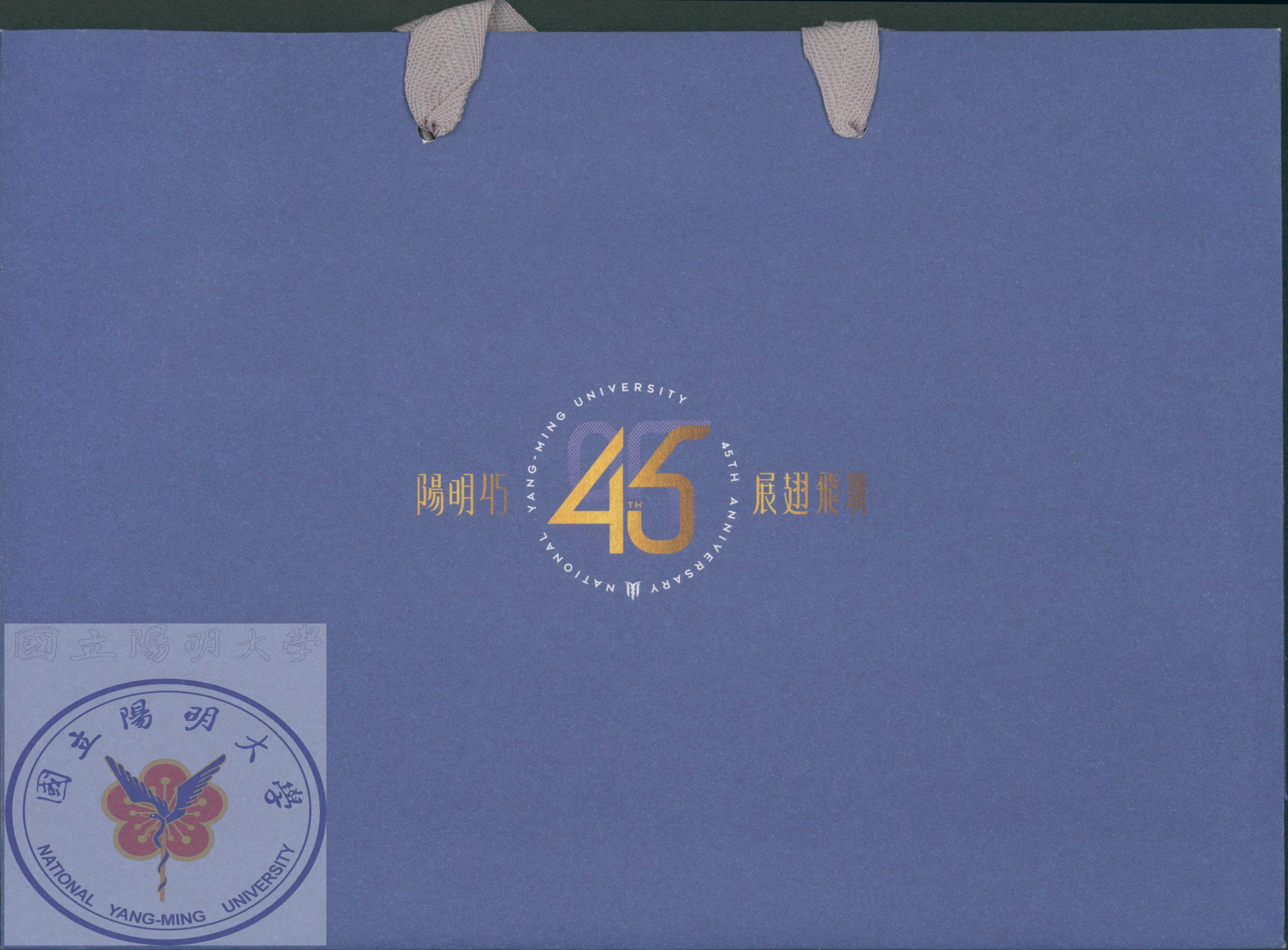 45週年校慶紀念提袋,為藍色紙袋與灰色手提繩。/學務處