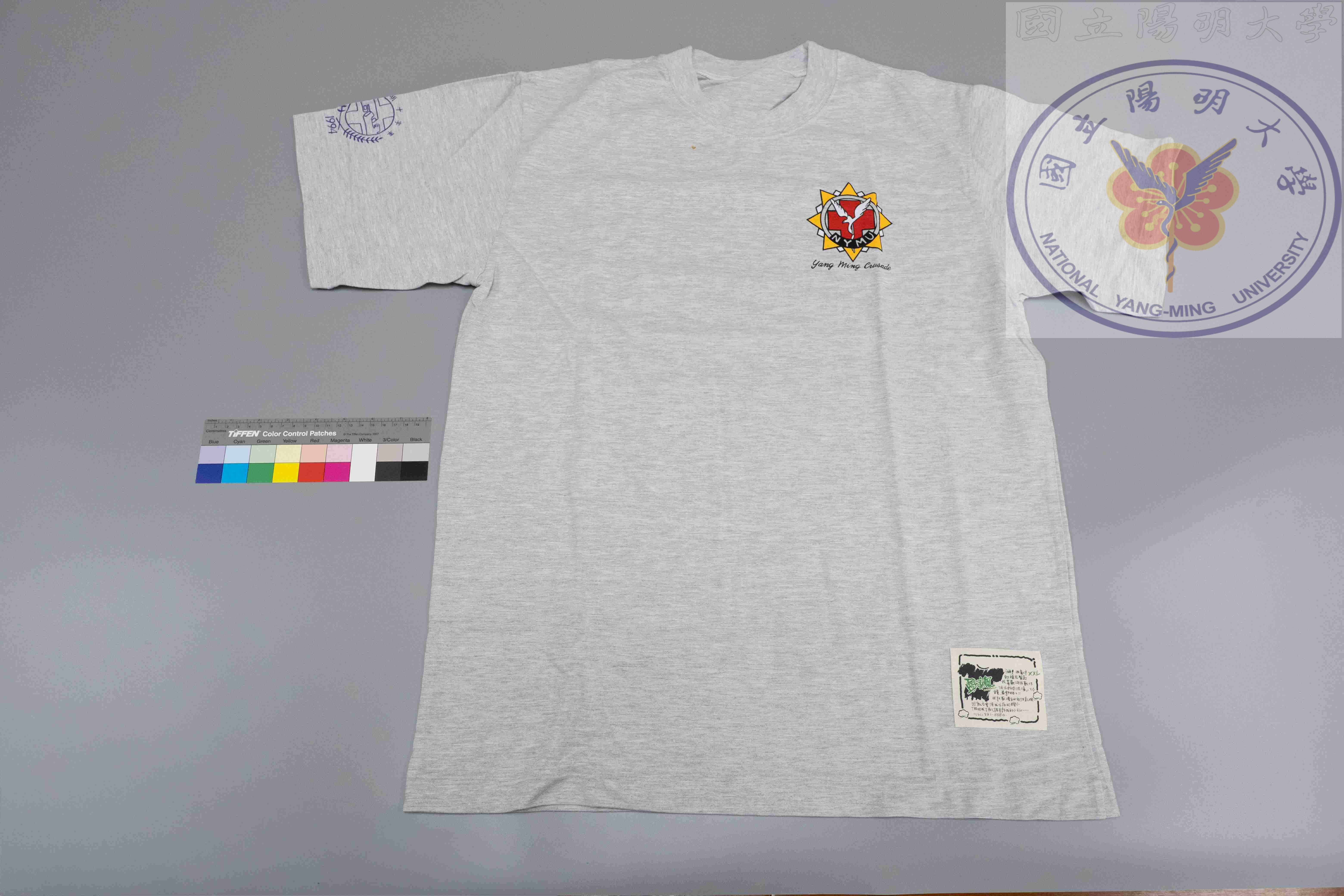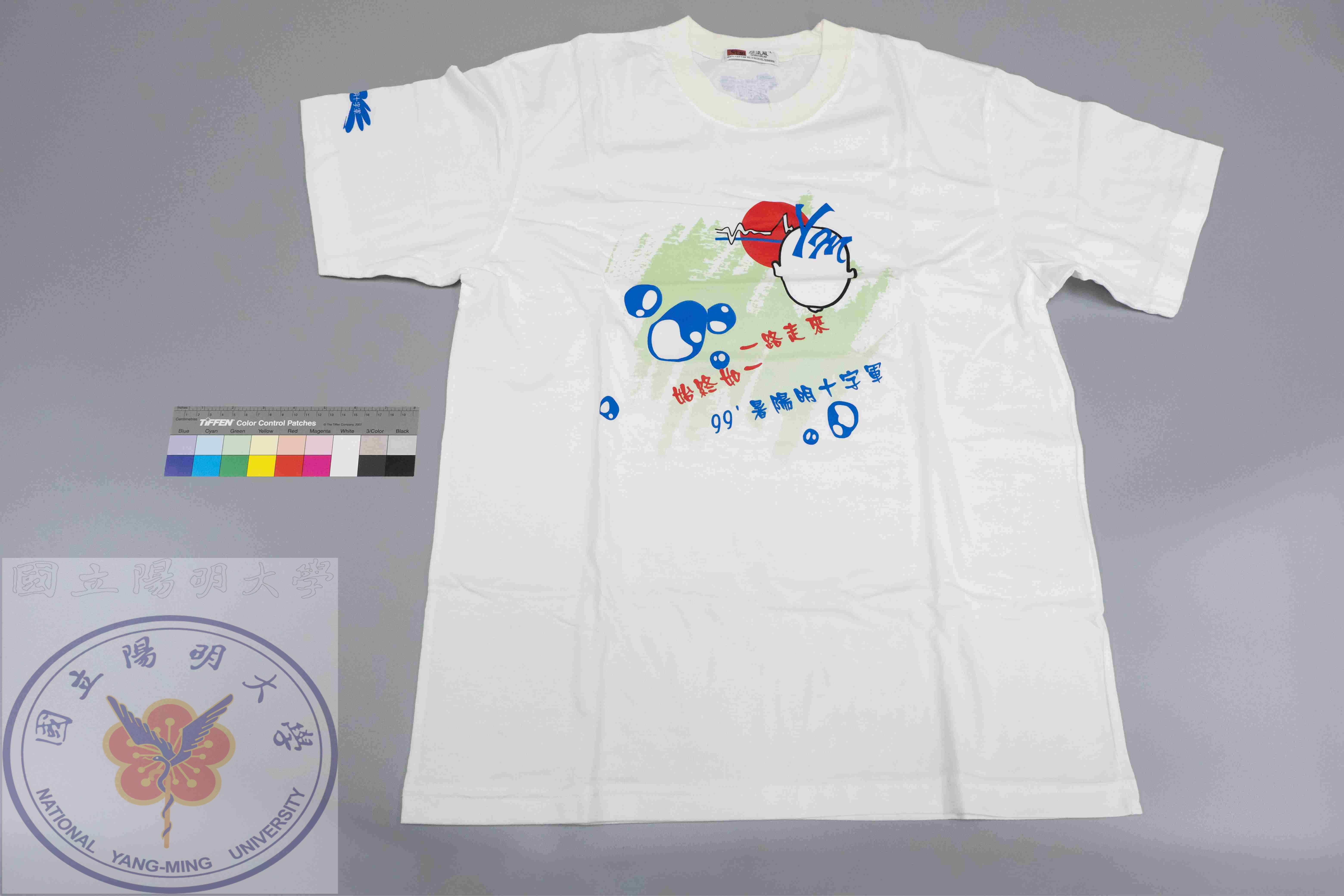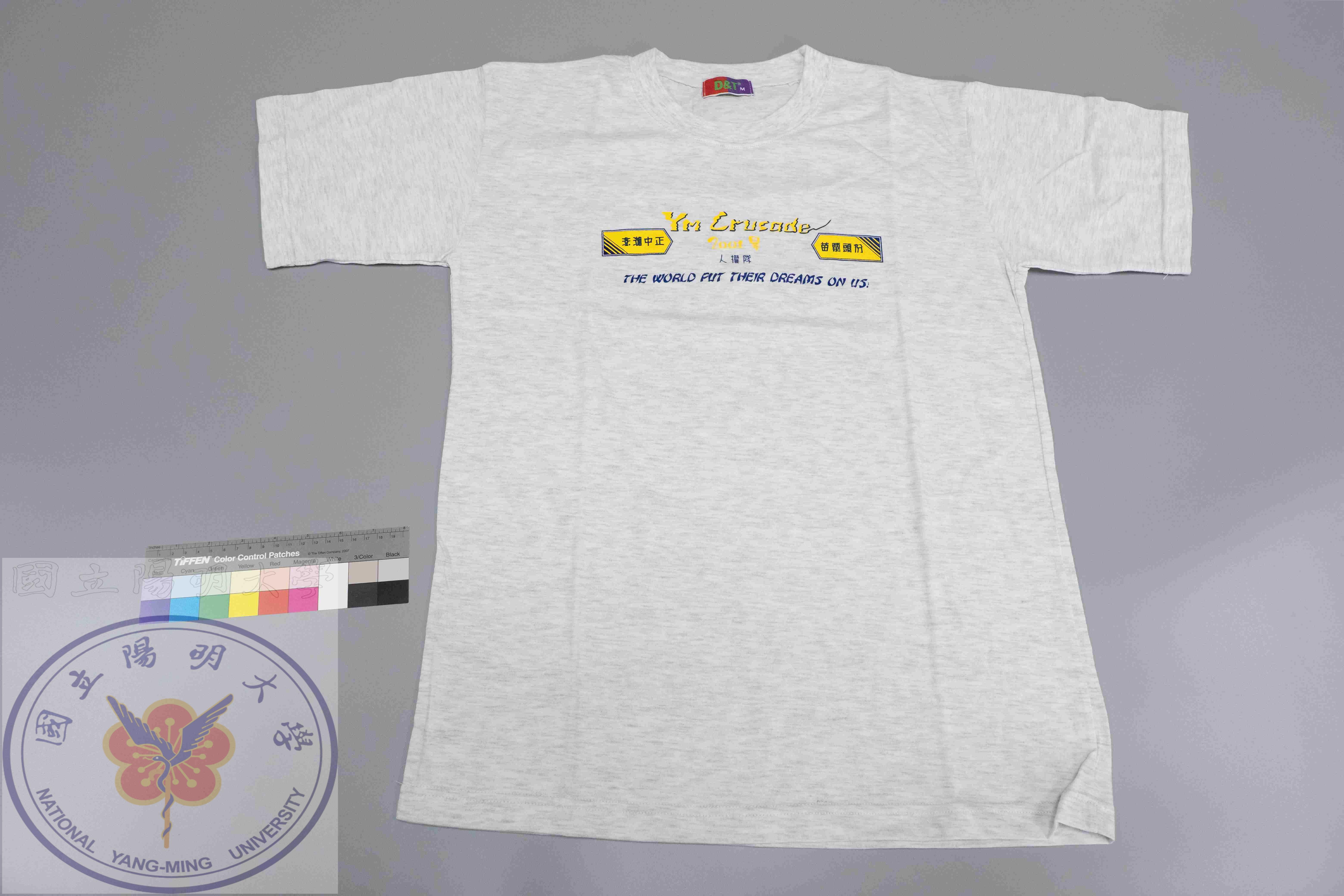 1999年暑期國立陽明大學十字軍社T恤,右側衣袖印有年份,正面印有「一路走來 始終如一」字樣。/左..