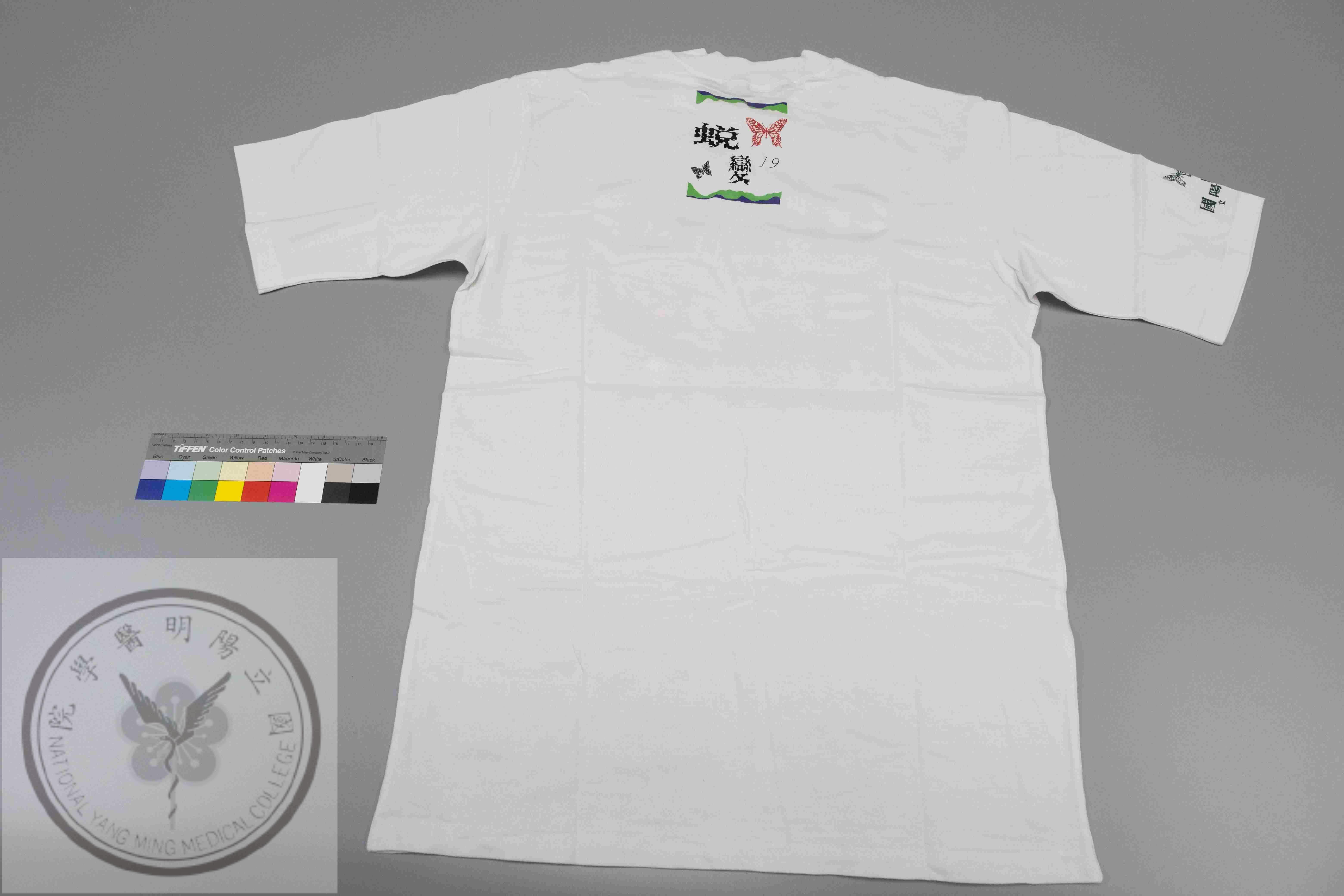 國立陽明醫學院19屆院慶短袖T恤,正面印有「新大學」字樣,背面印有「蛻變19」字樣。/左智慧(學務..