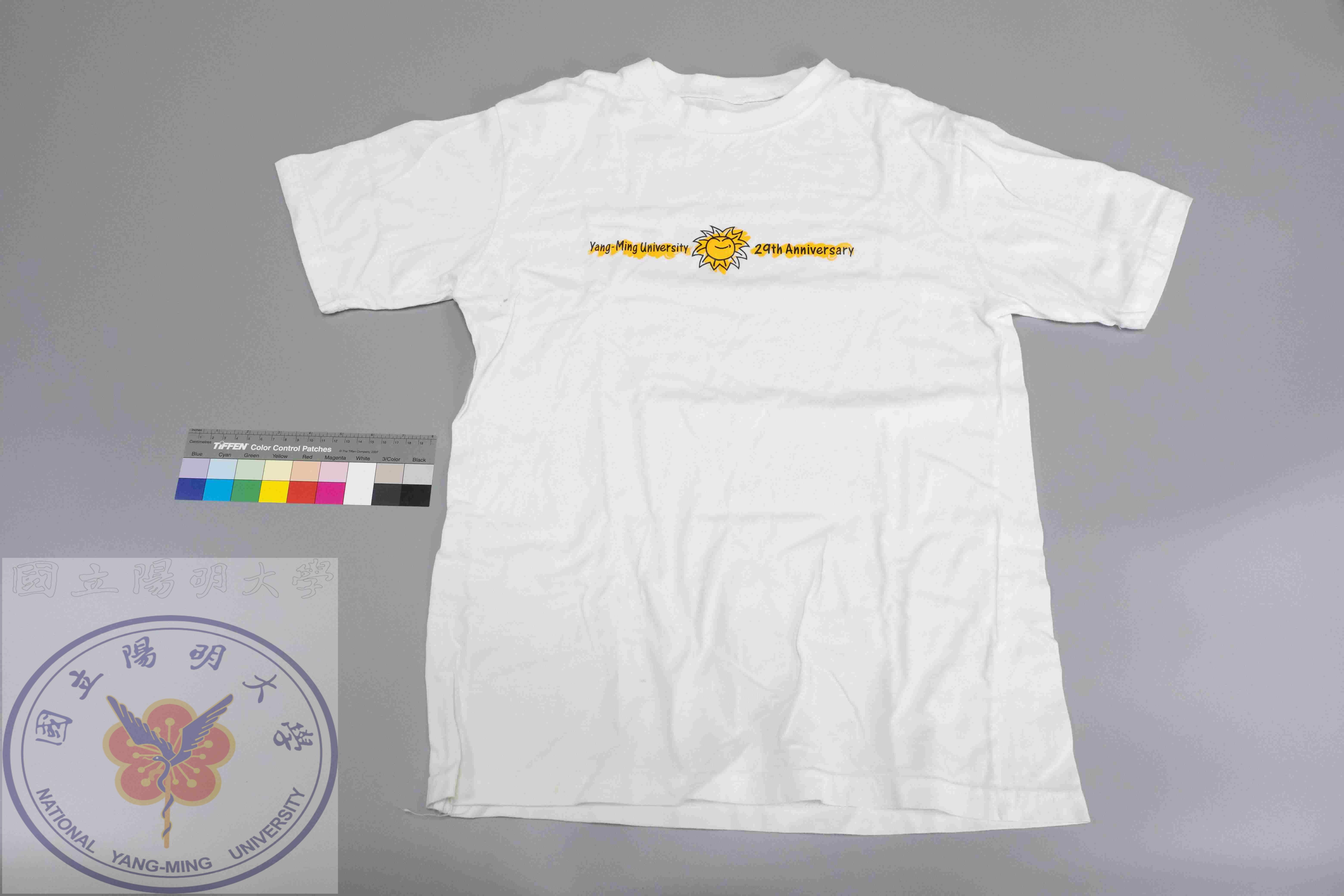 國立陽明大學29週年校慶短袖T恤,背面印有部分校歌歌詞。/左智慧(學務處)捐贈