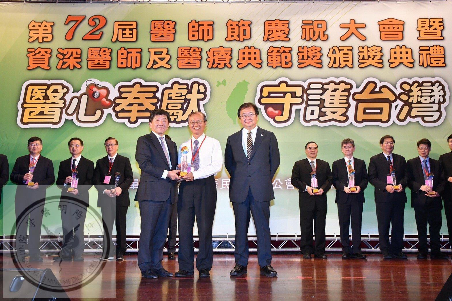 民國108年賴靖文校友(中)獲中華民國醫師公會全國聯合會頒發之「台灣醫療典範獎」。/賴靖文捐贈
