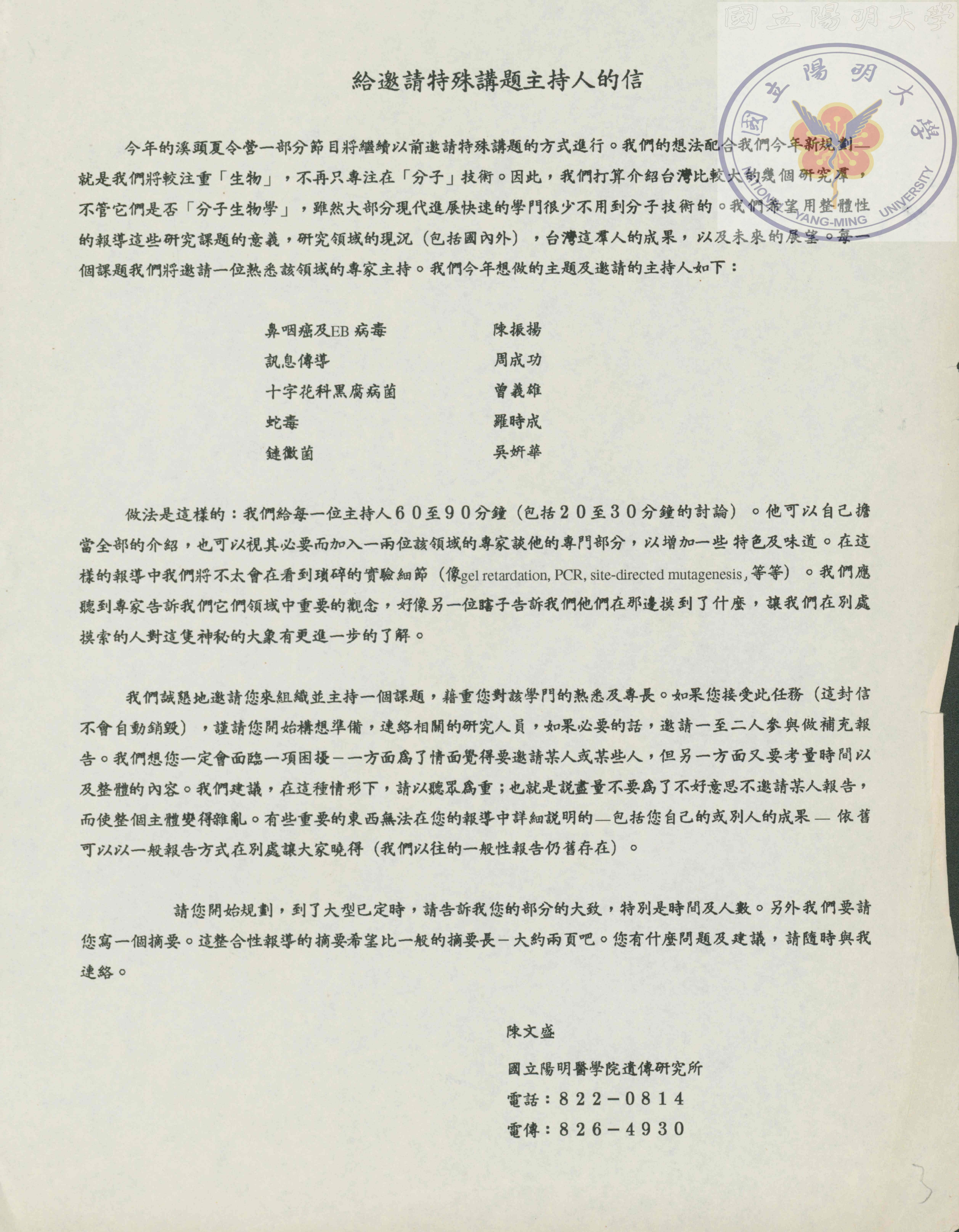 給邀請特殊講題主持人的信,內容含1994年的溪頭生物夏令營邀請的研究課題主持人,以及流程說明。/陳..