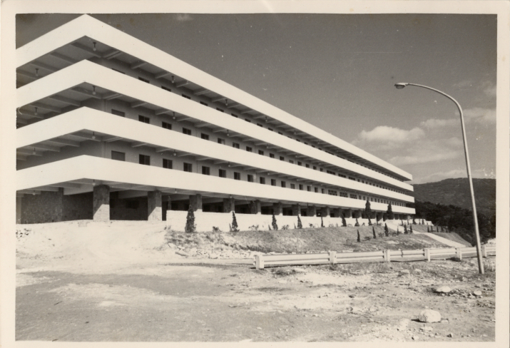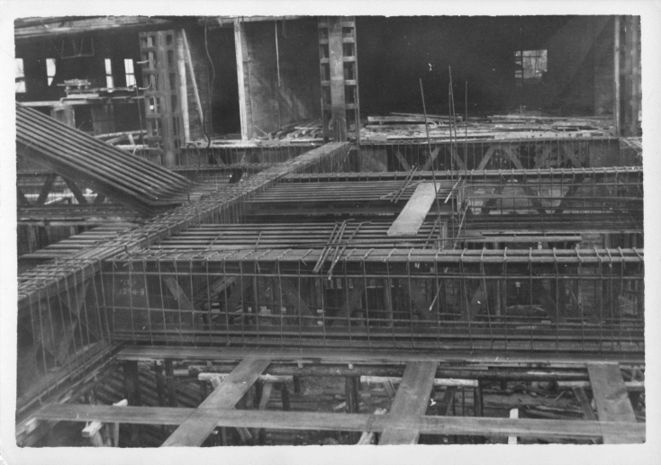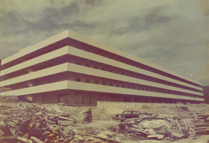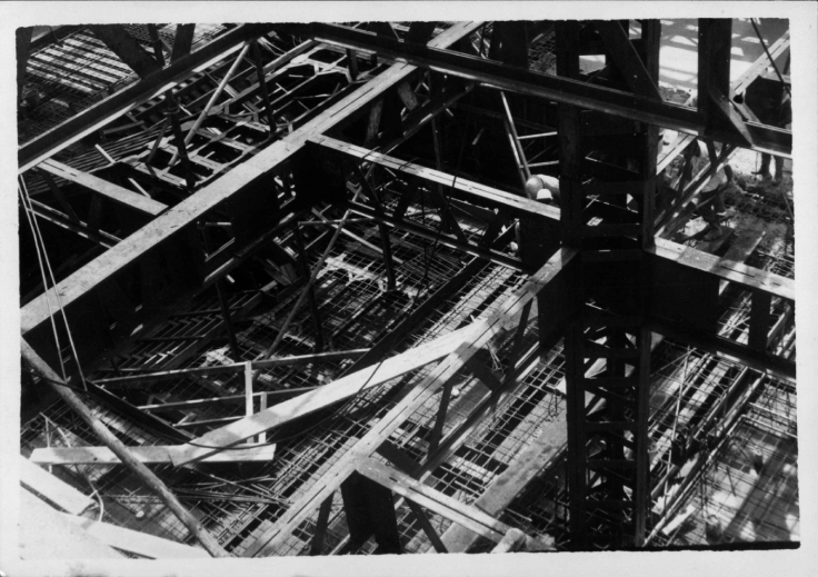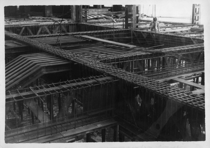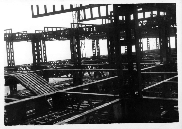 實驗大樓的主結構即將完成,施工時的鋼筋水泥清晰可見。