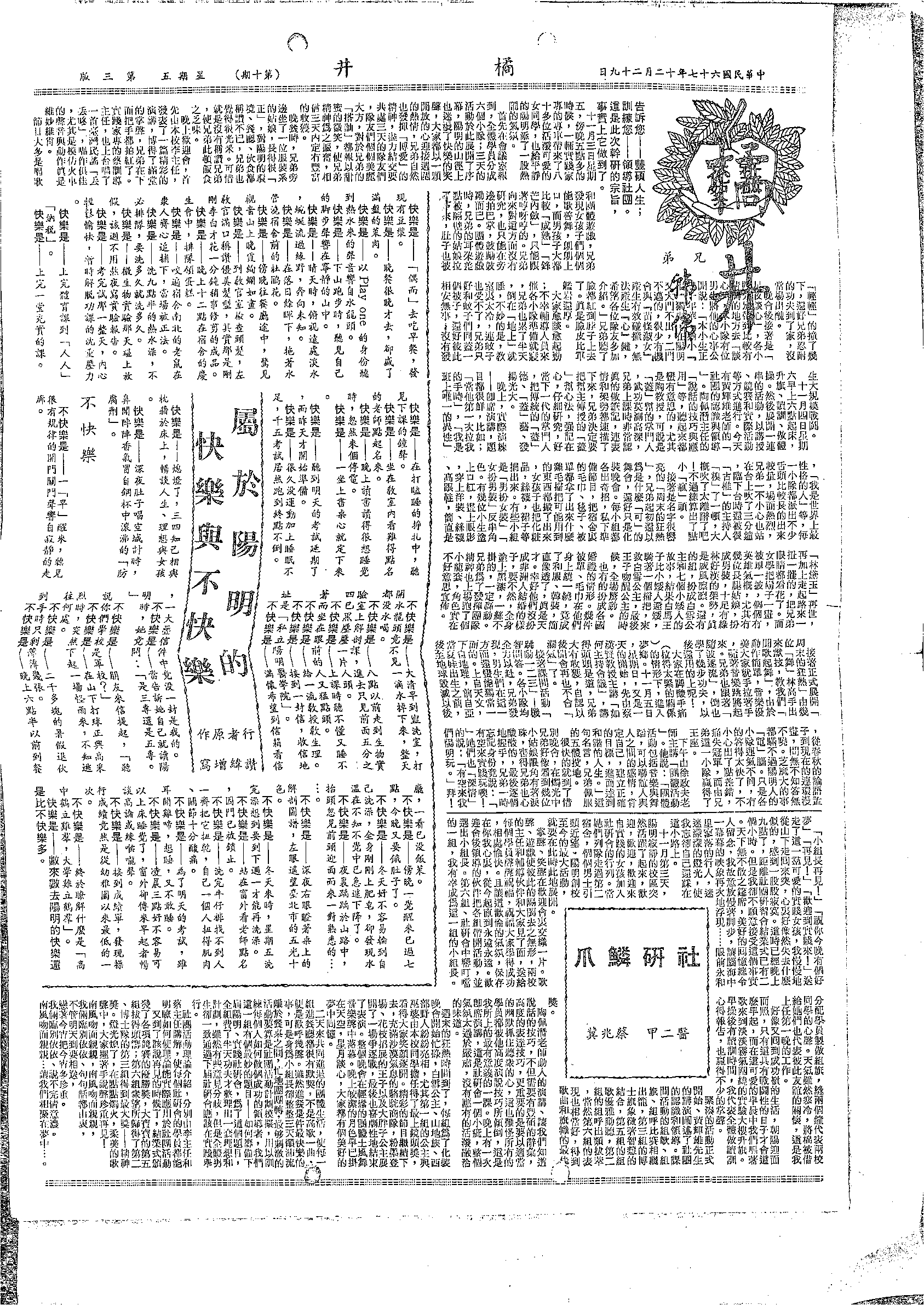 橘井 第16期。內含:首屆歲暮音樂晚會,12月18日於介壽堂舉行,一流高手演出 愛杏初試啼聲、縮減..