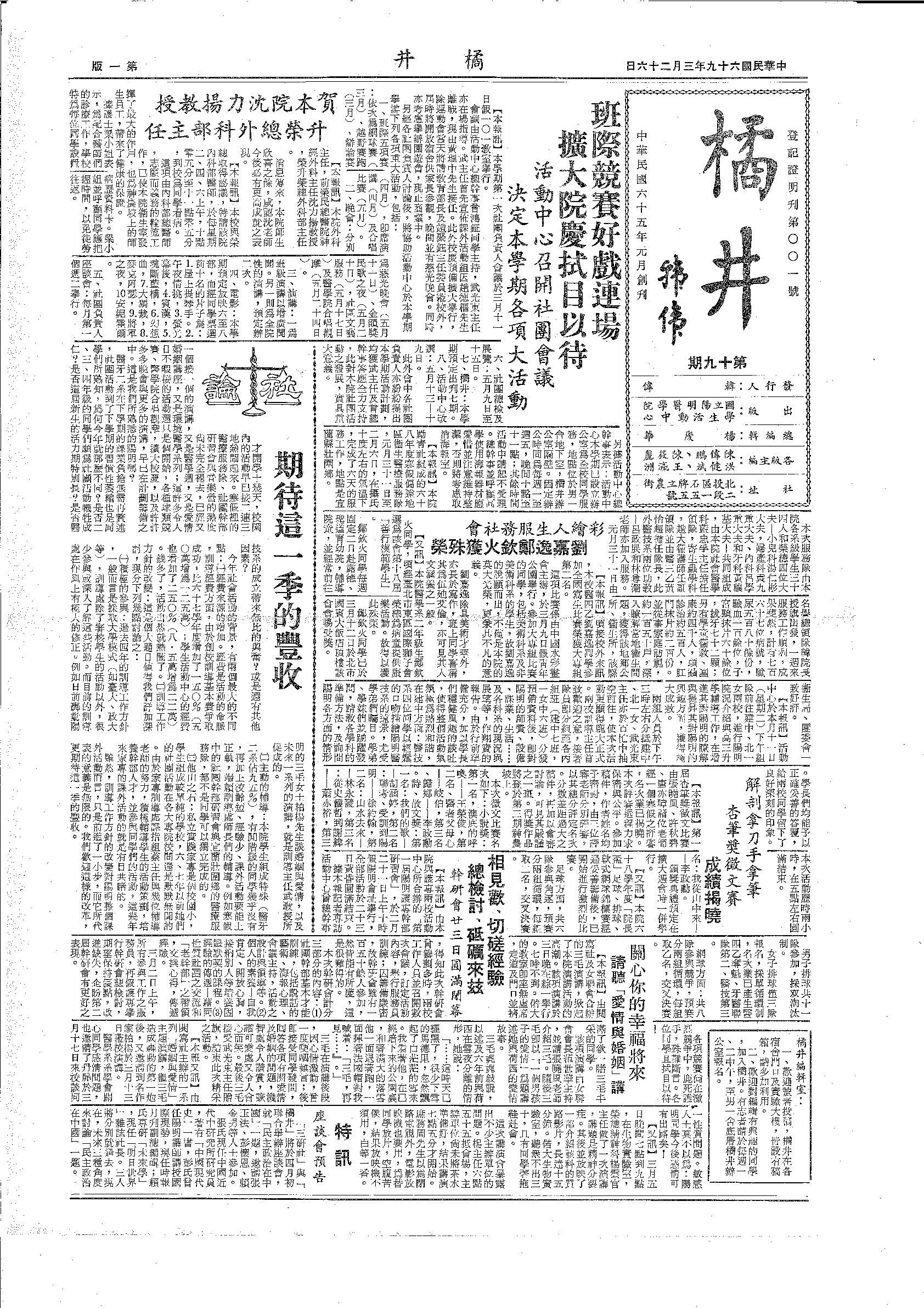 橘井 第19期。內含:班際競賽好戲連場,擴大院慶拭目以待、解剖拿刀手拿筆,杏筆獎徵文賽、談陽明社團..