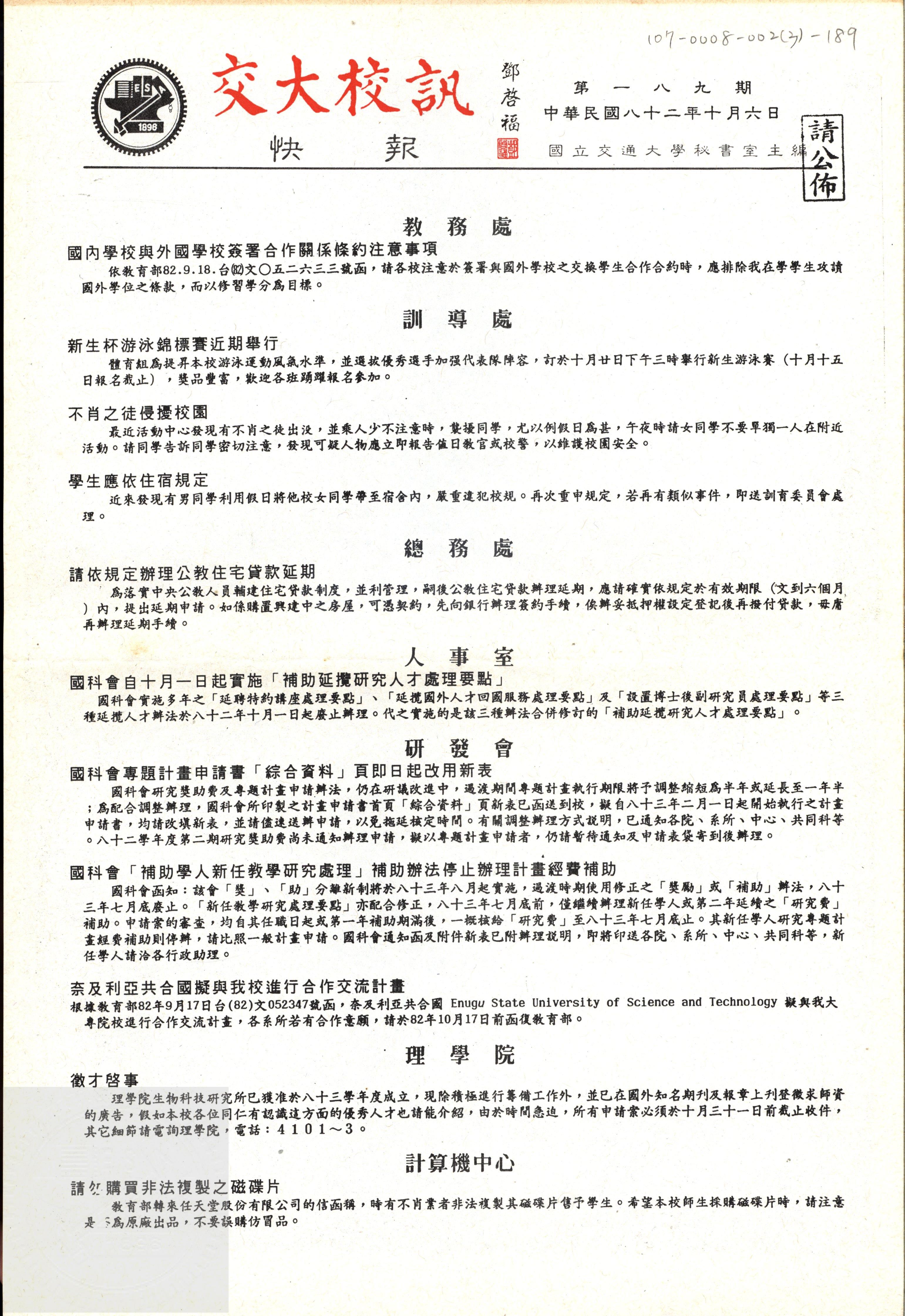 交大校訊快報 第一八九期,陳茂傑教授贈。