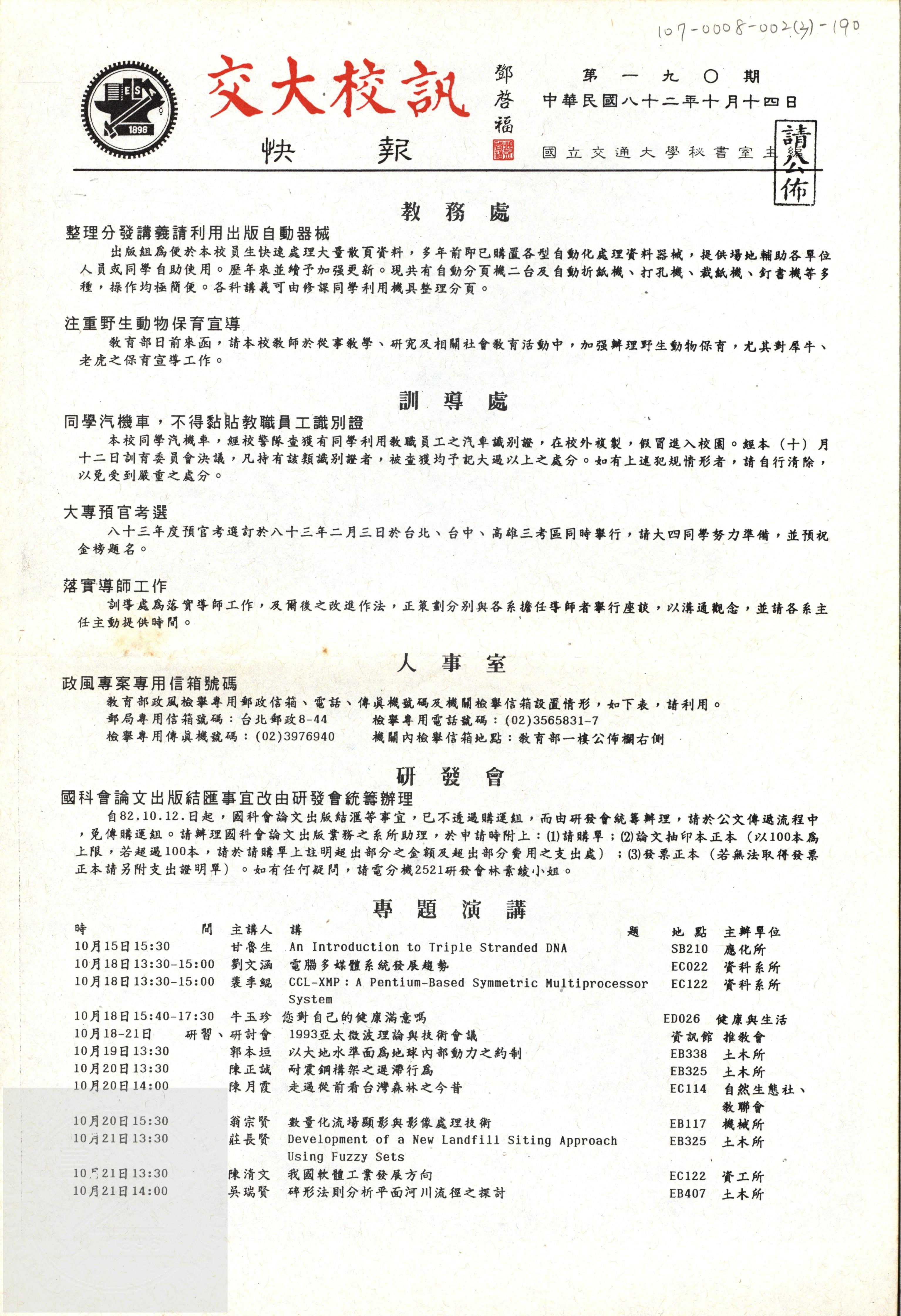 交大校訊快報 第一九O期,陳茂傑教授贈。