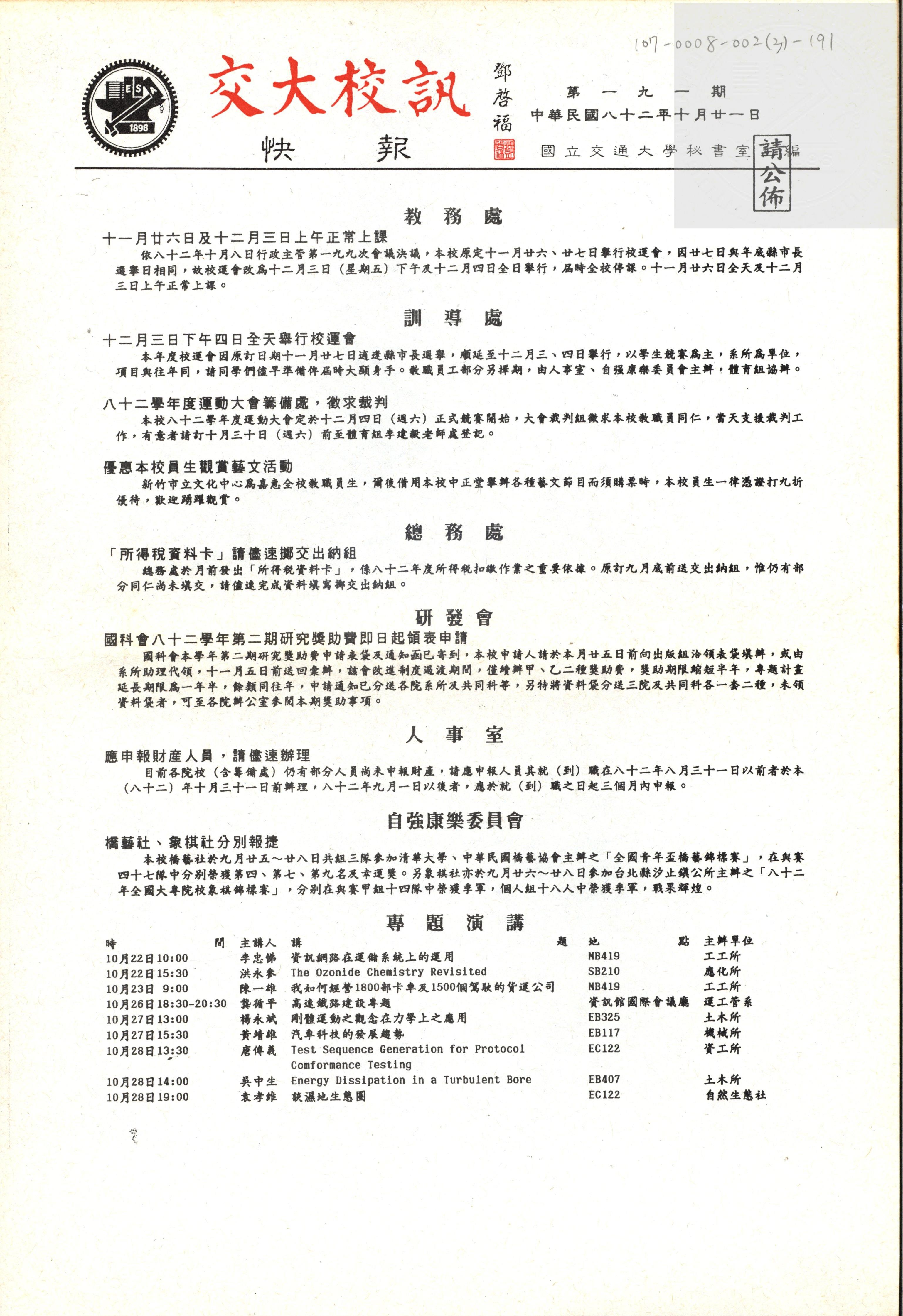 交大校訊快報 第一九一期,陳茂傑教授贈。