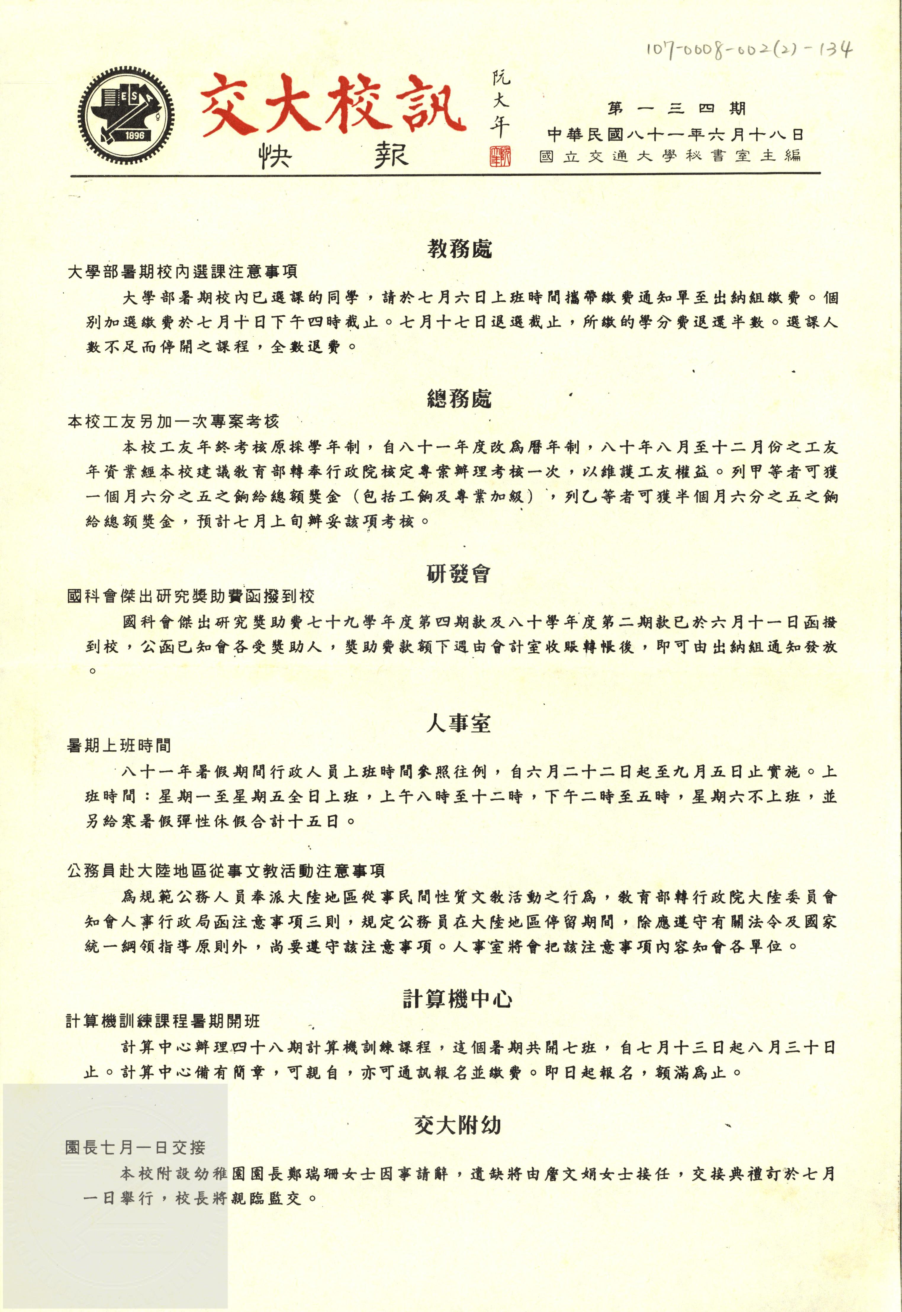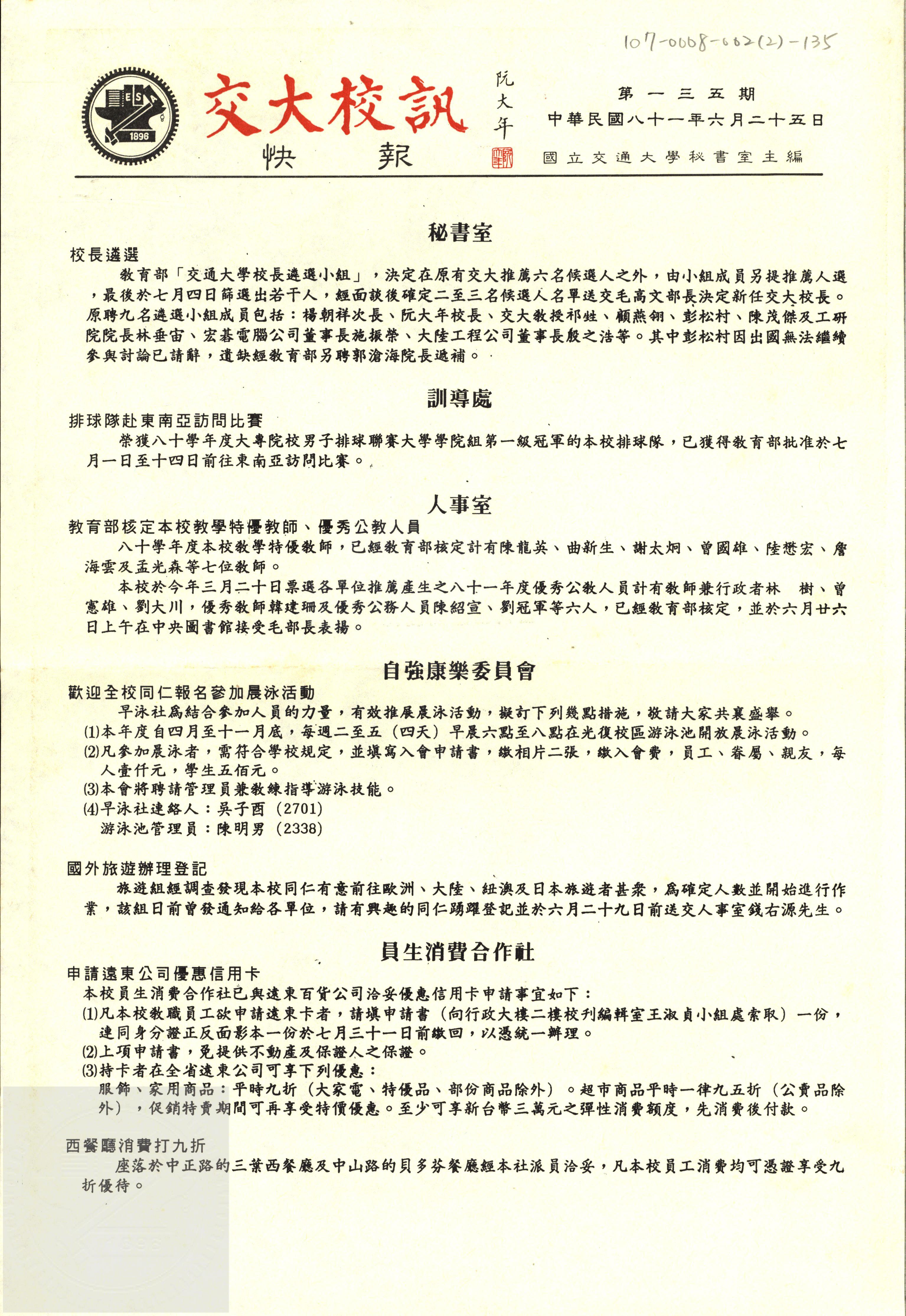 交大校訊快報 第一三五期,陳茂傑教授贈。