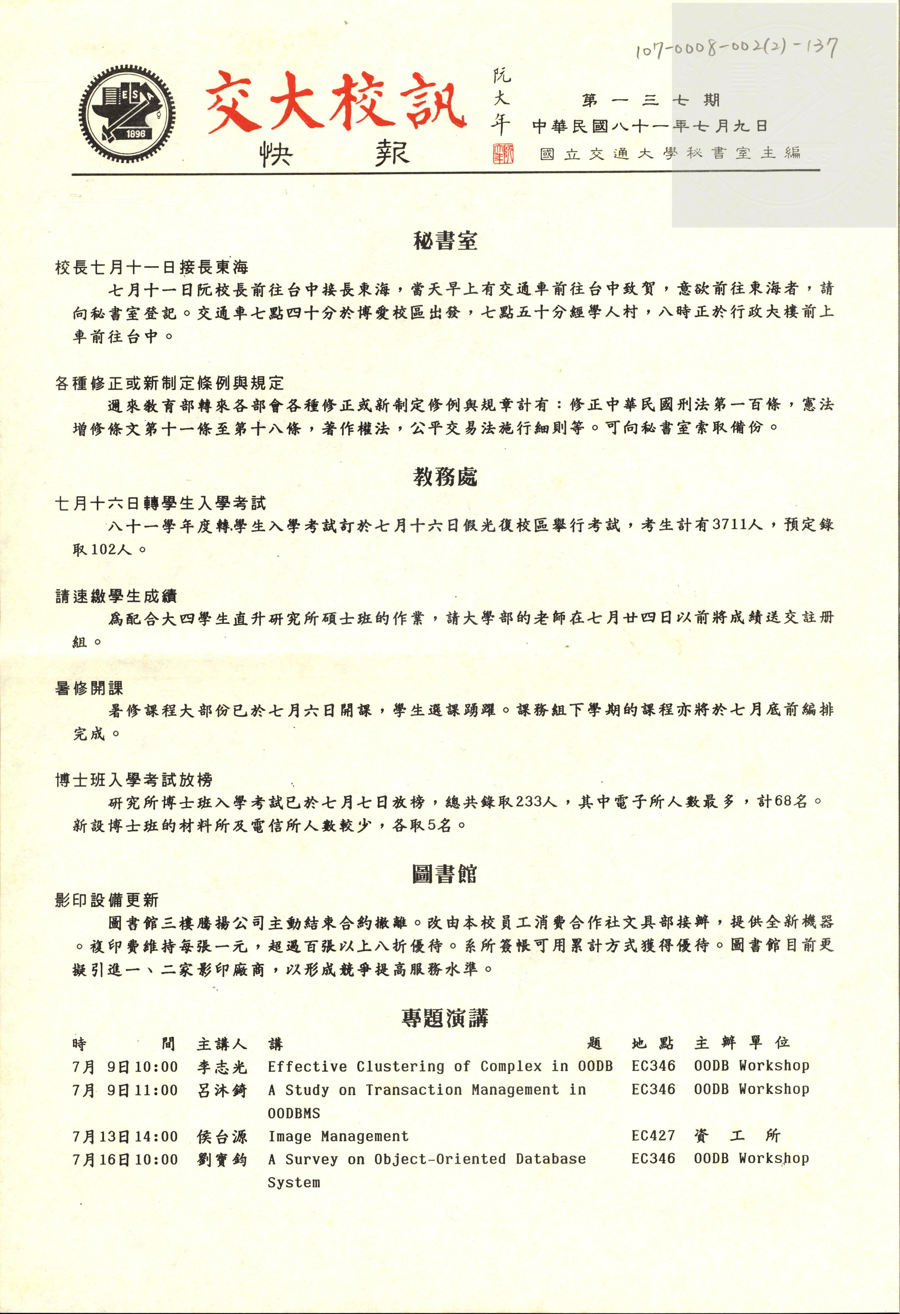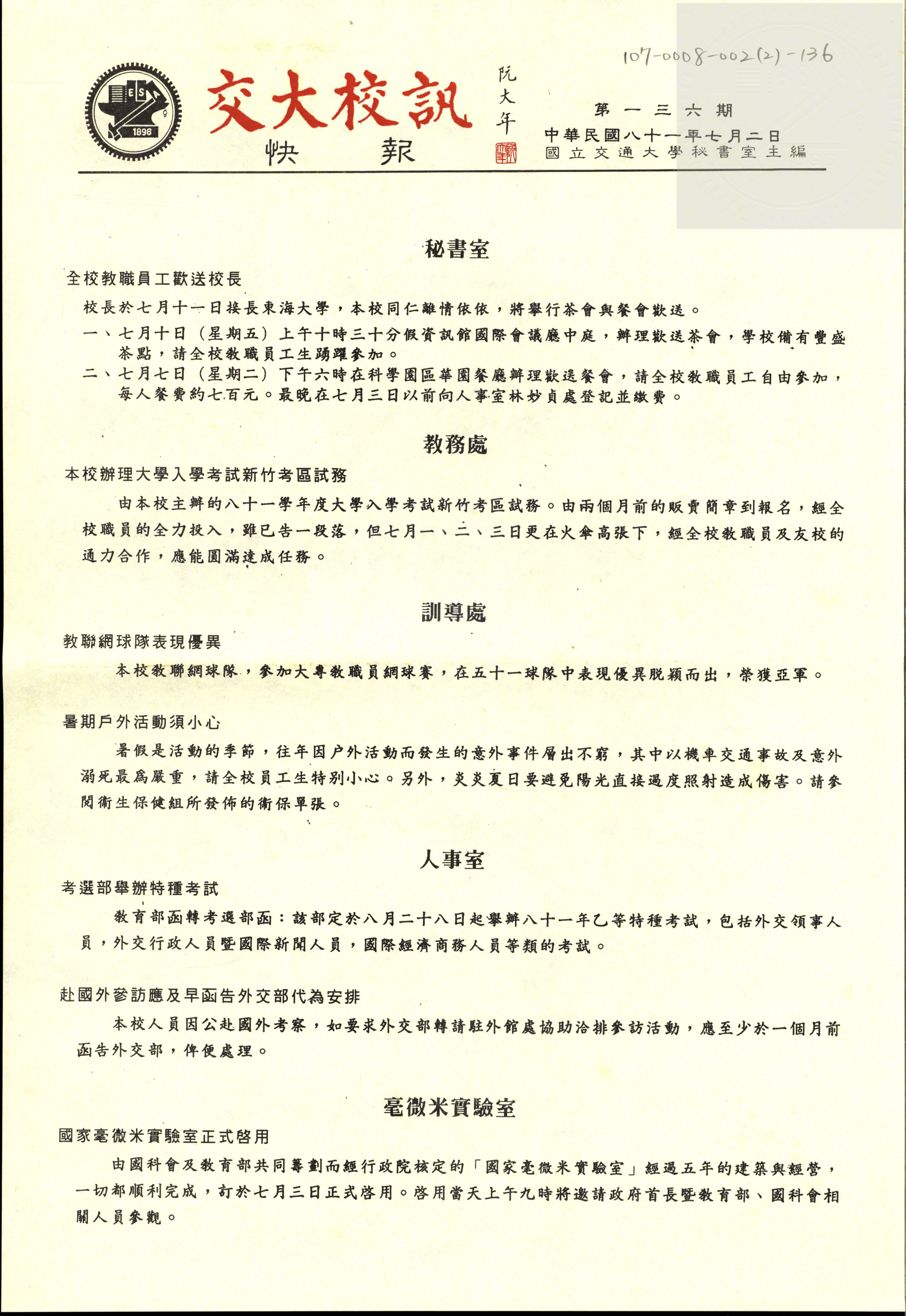 交大校訊快報 第一三O期,陳茂傑教授贈。