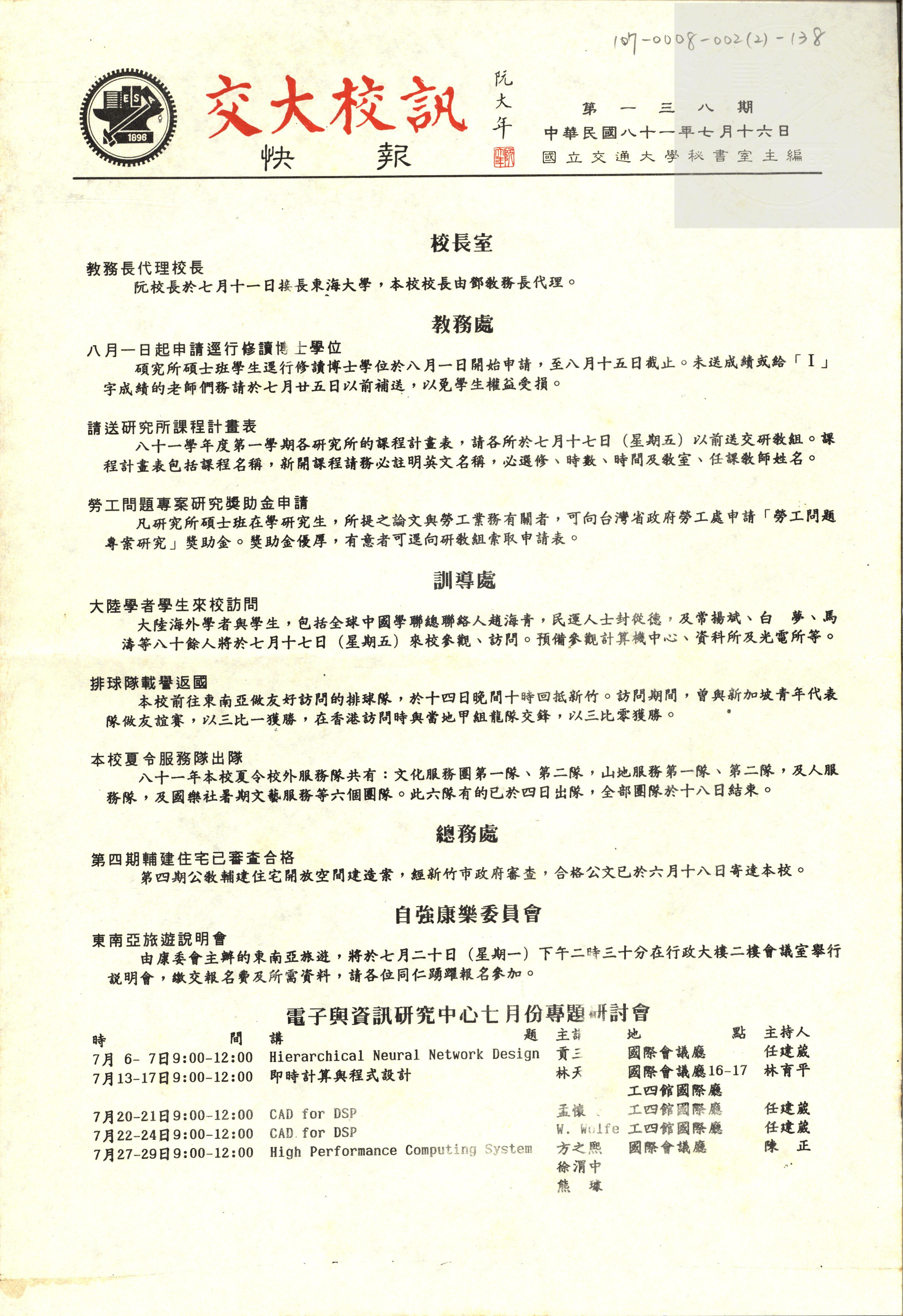 交大校訊快報 第一三八期,陳茂傑教授贈。