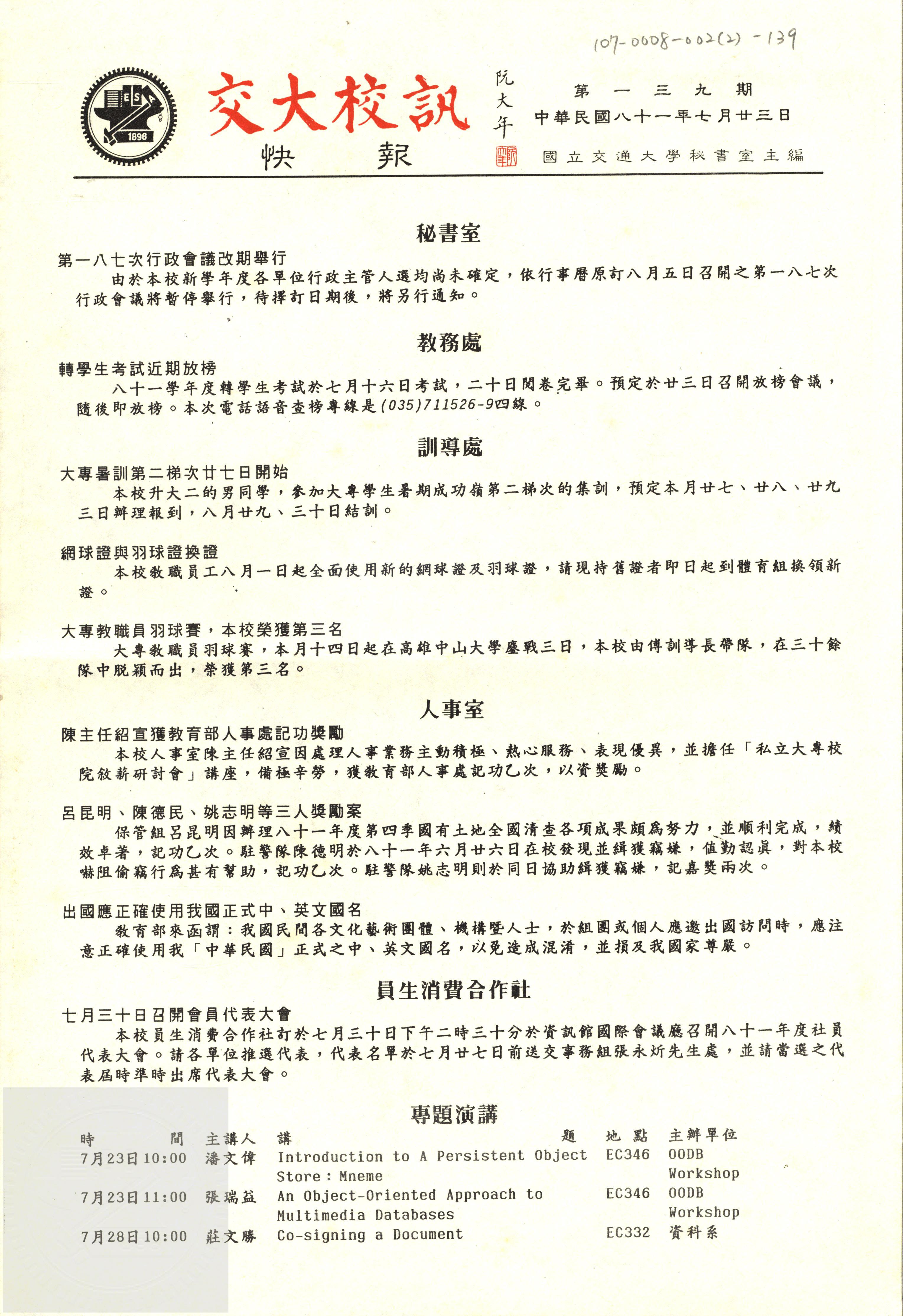 交大校訊快報 第一三九期,陳茂傑教授贈。