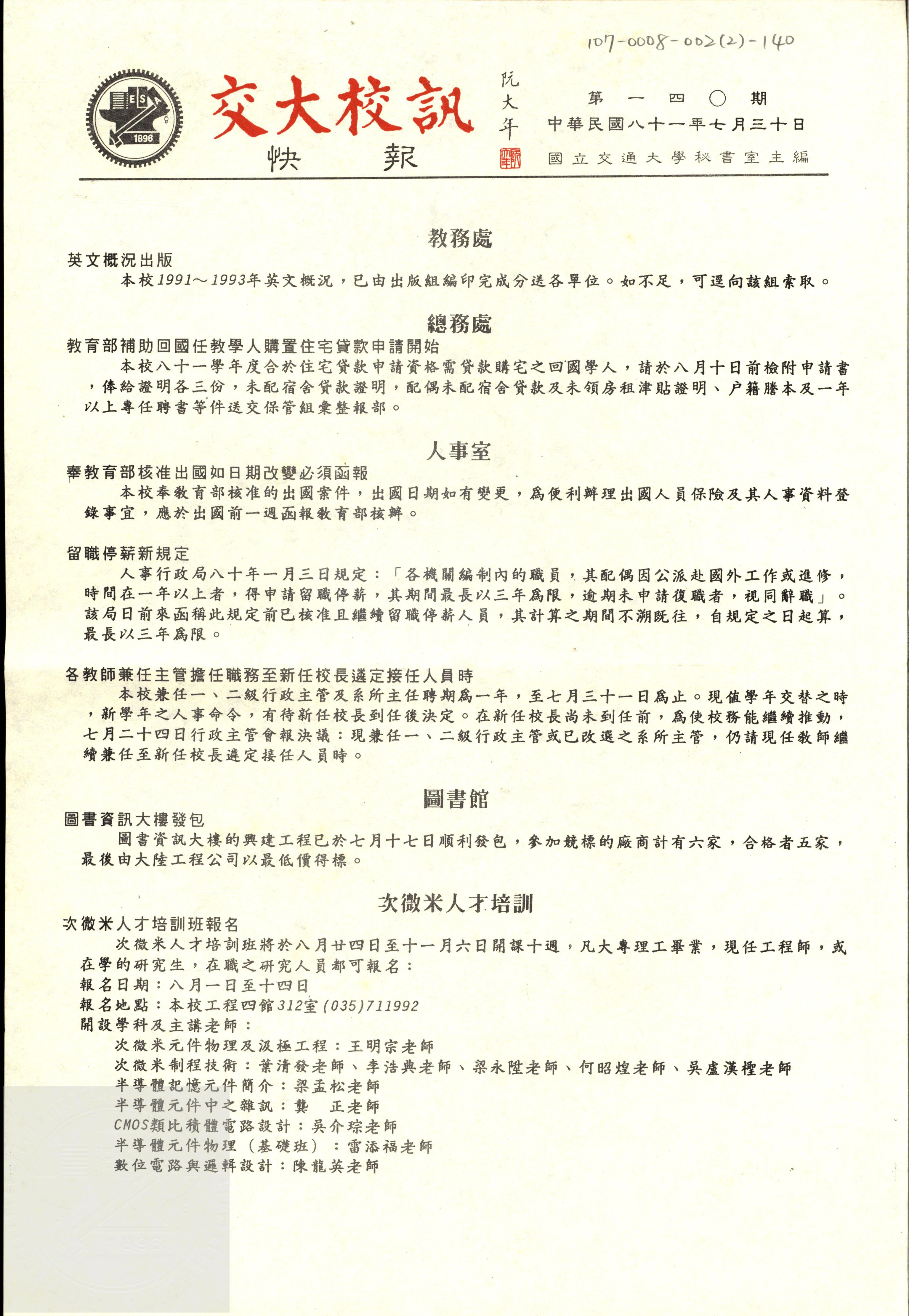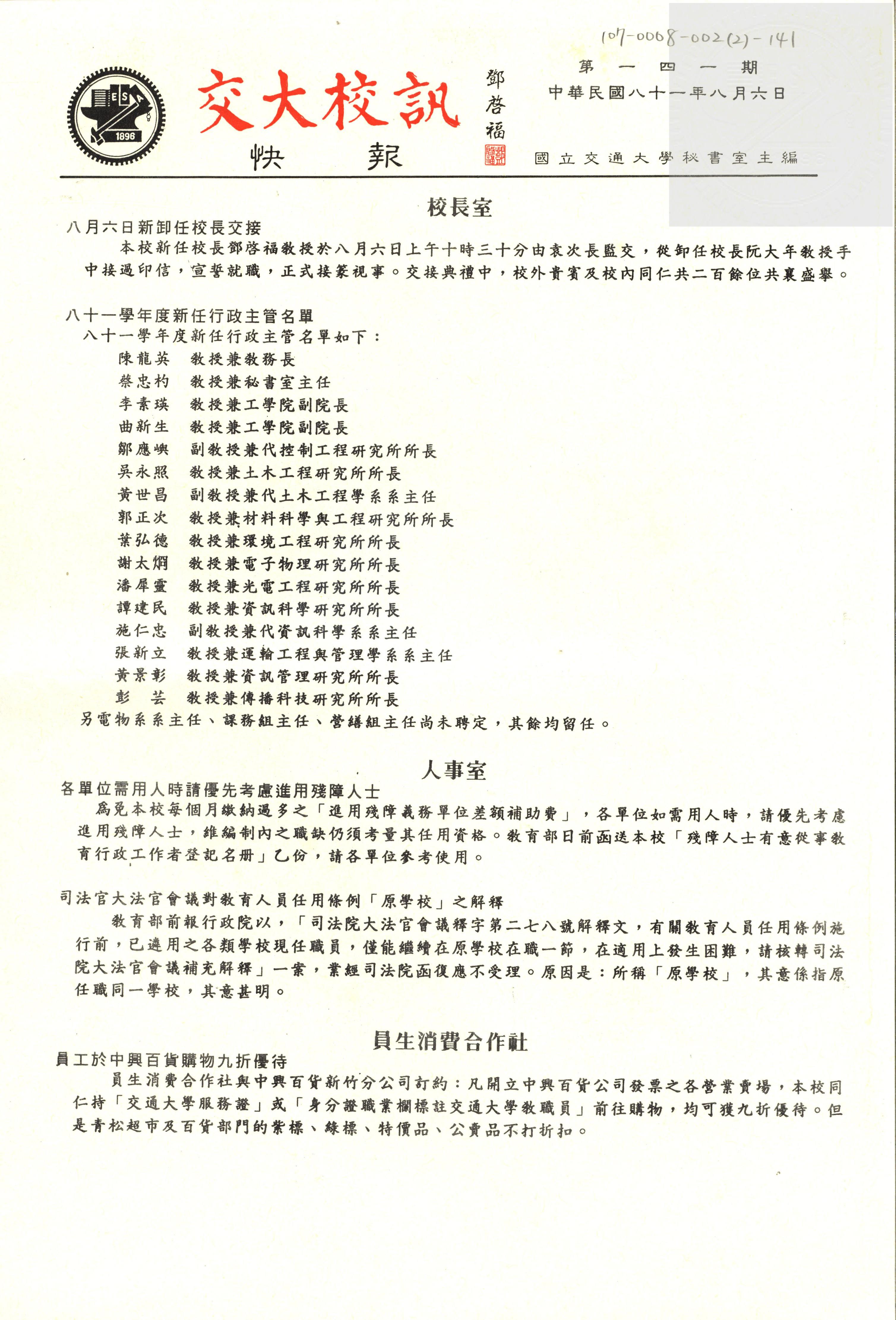 交大校訊快報 第一四O期,陳茂傑教授贈。