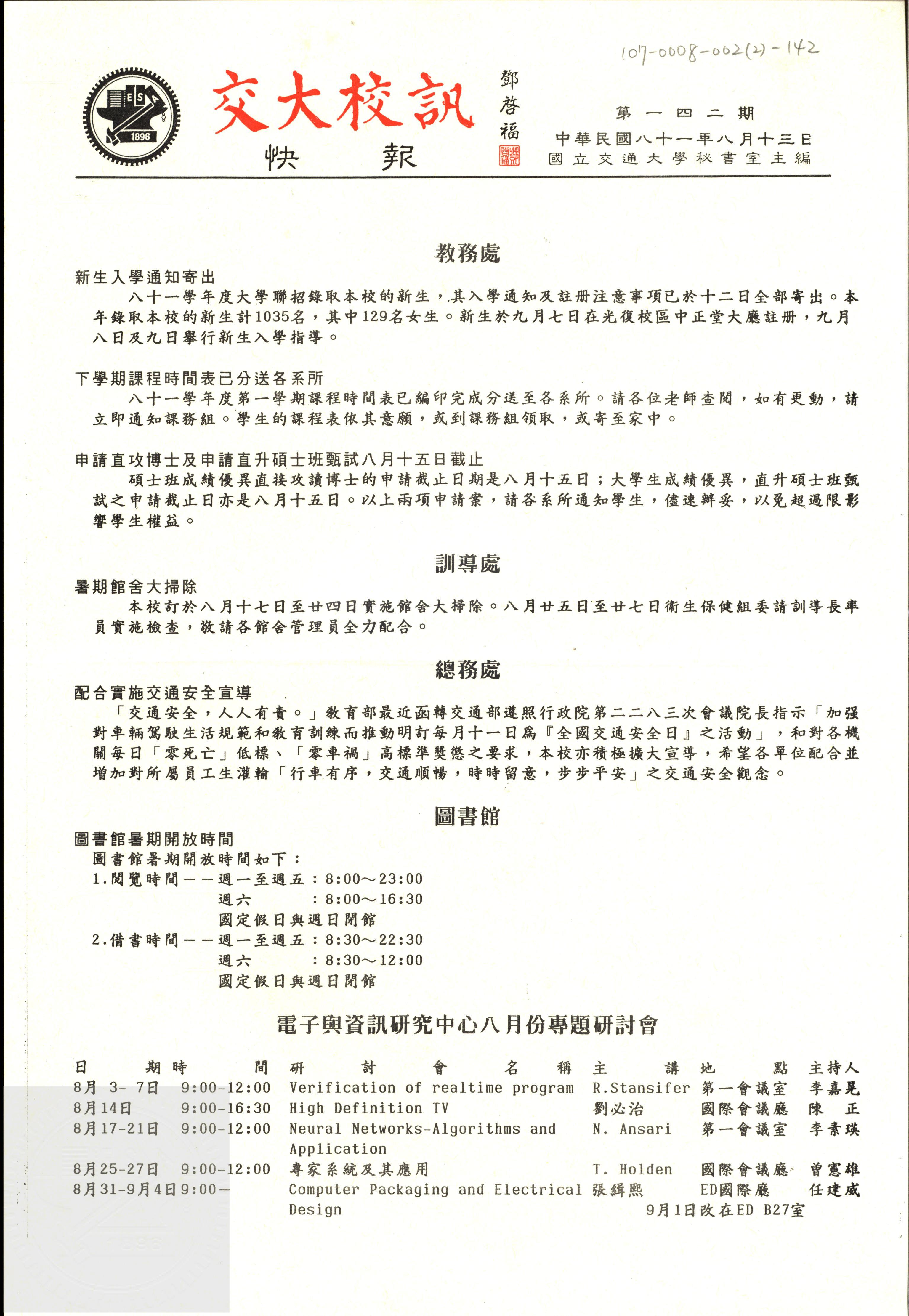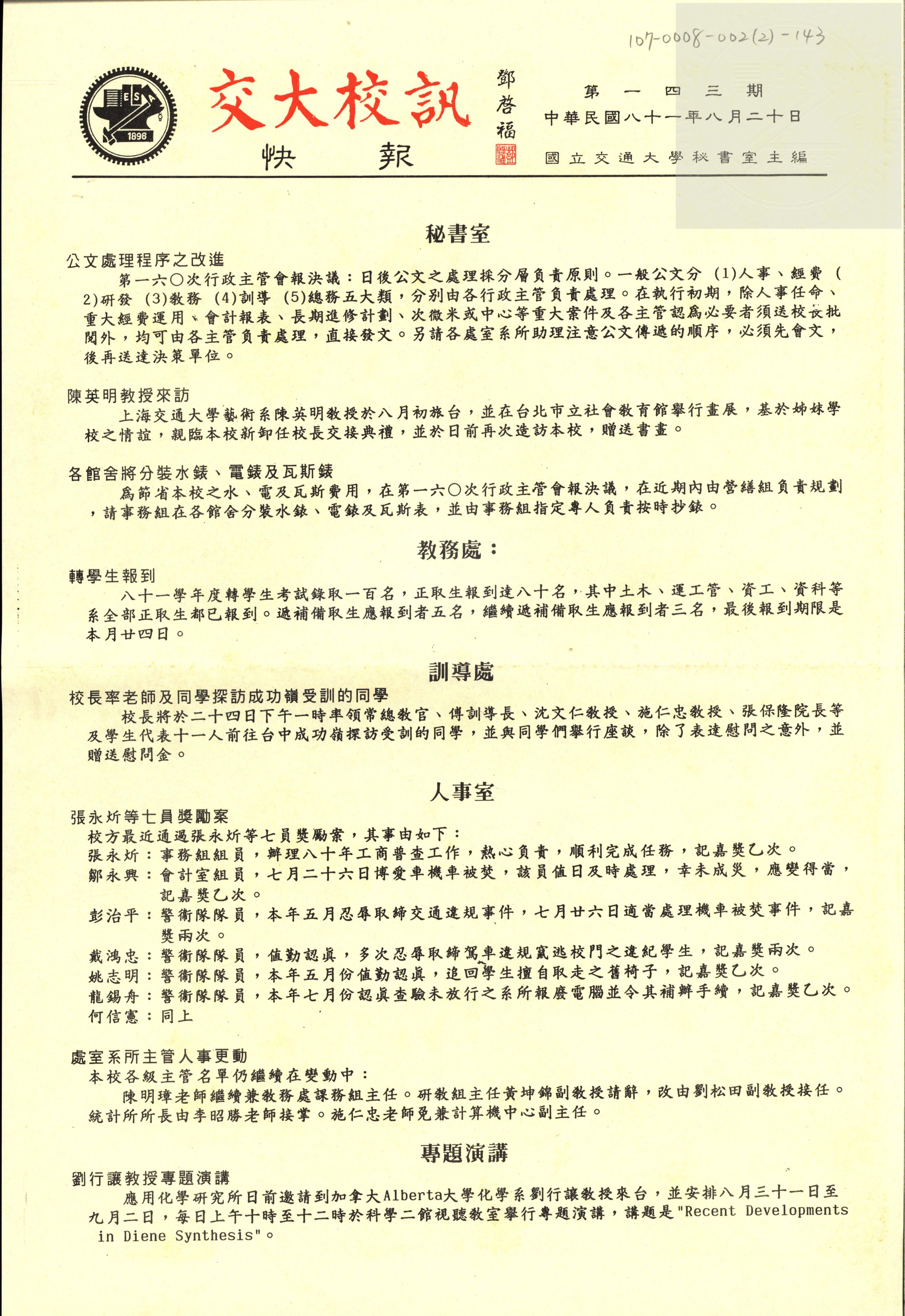 交大校訊快報 第一四三期,陳茂傑教授贈。
