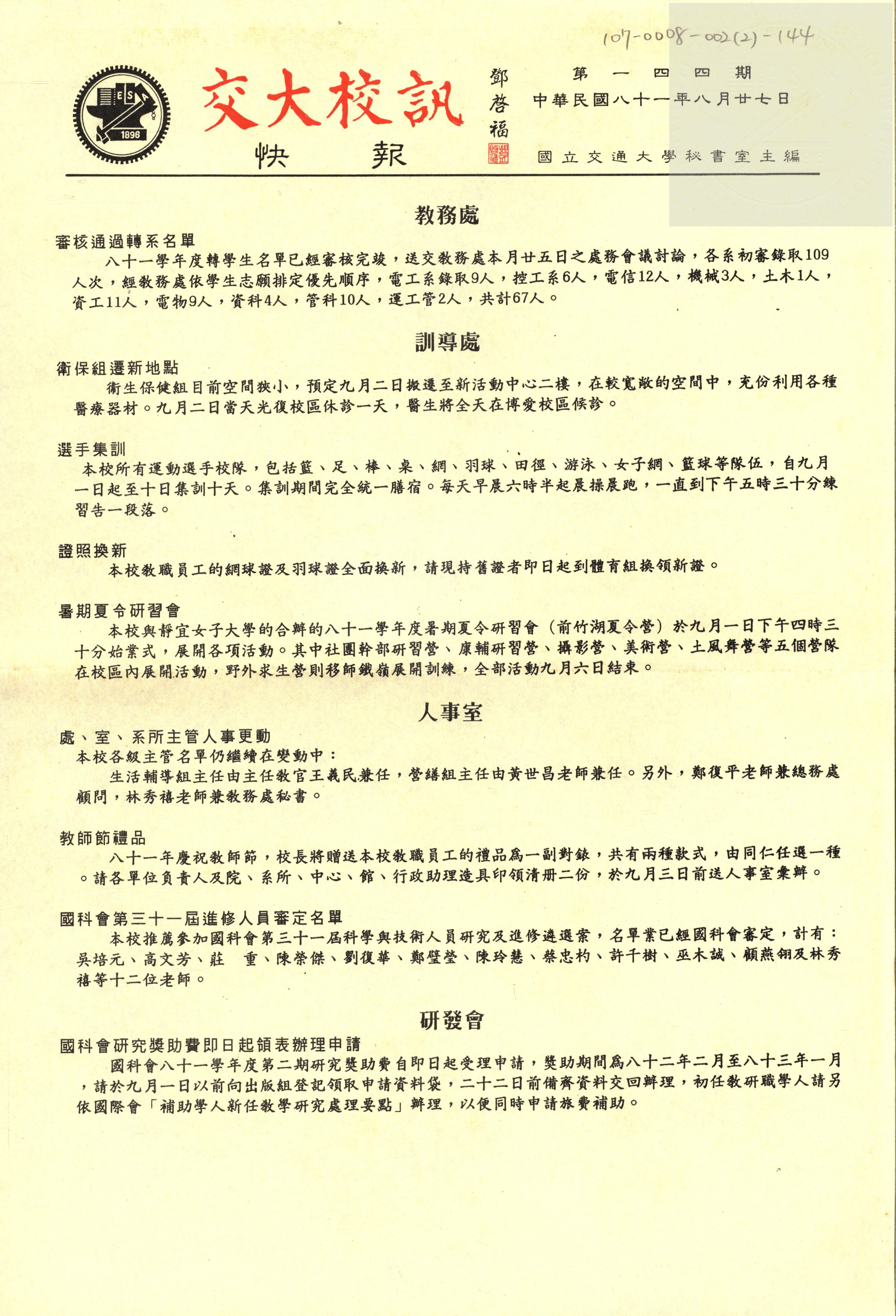 交大校訊快報 第一四四期,陳茂傑教授贈。