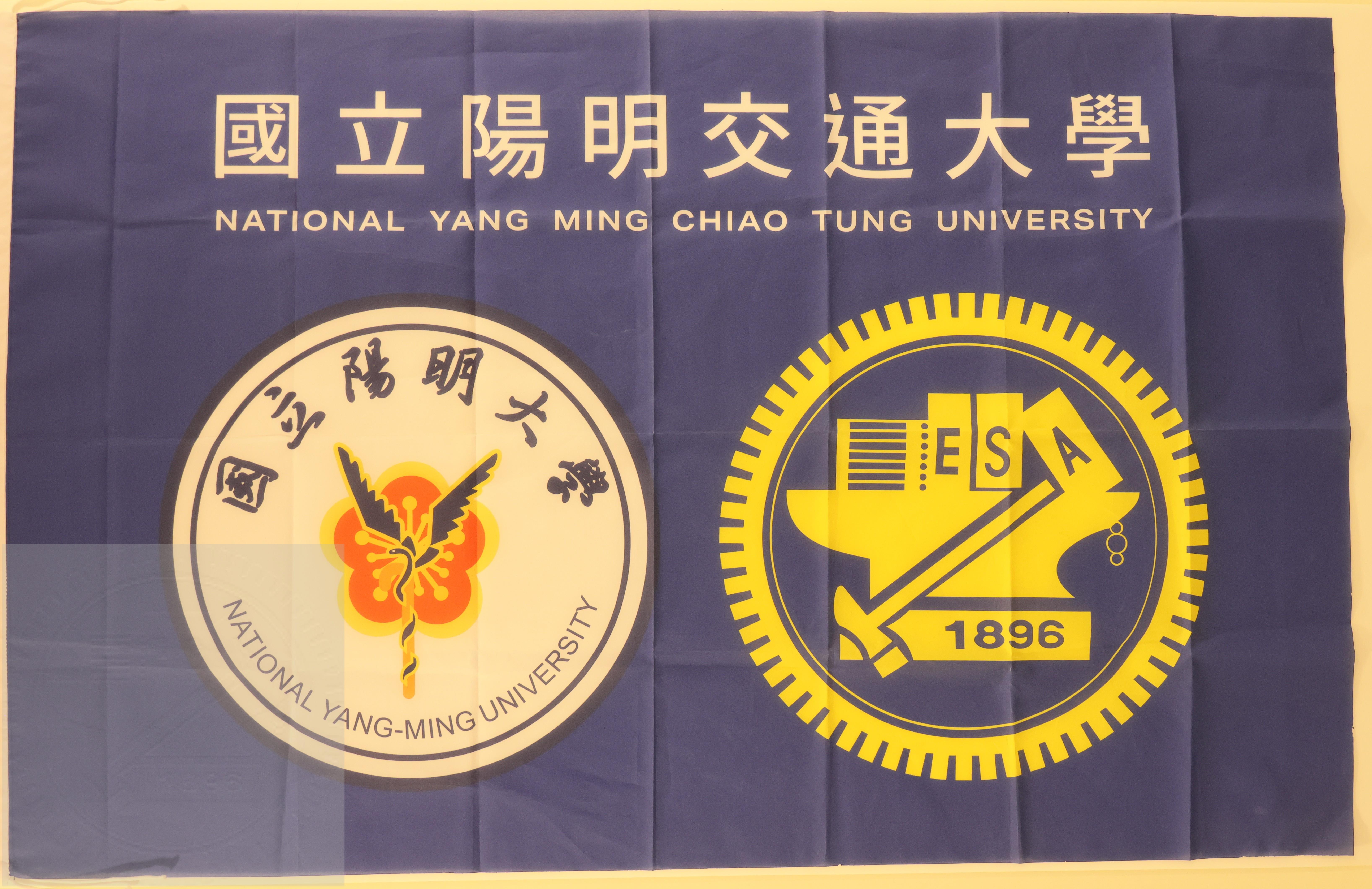 國立陽明交通大學2022年梅竹賽活動旗幟,有合校前兩校之校徽。此旗幟由師生自行設計製作,並非校方正..