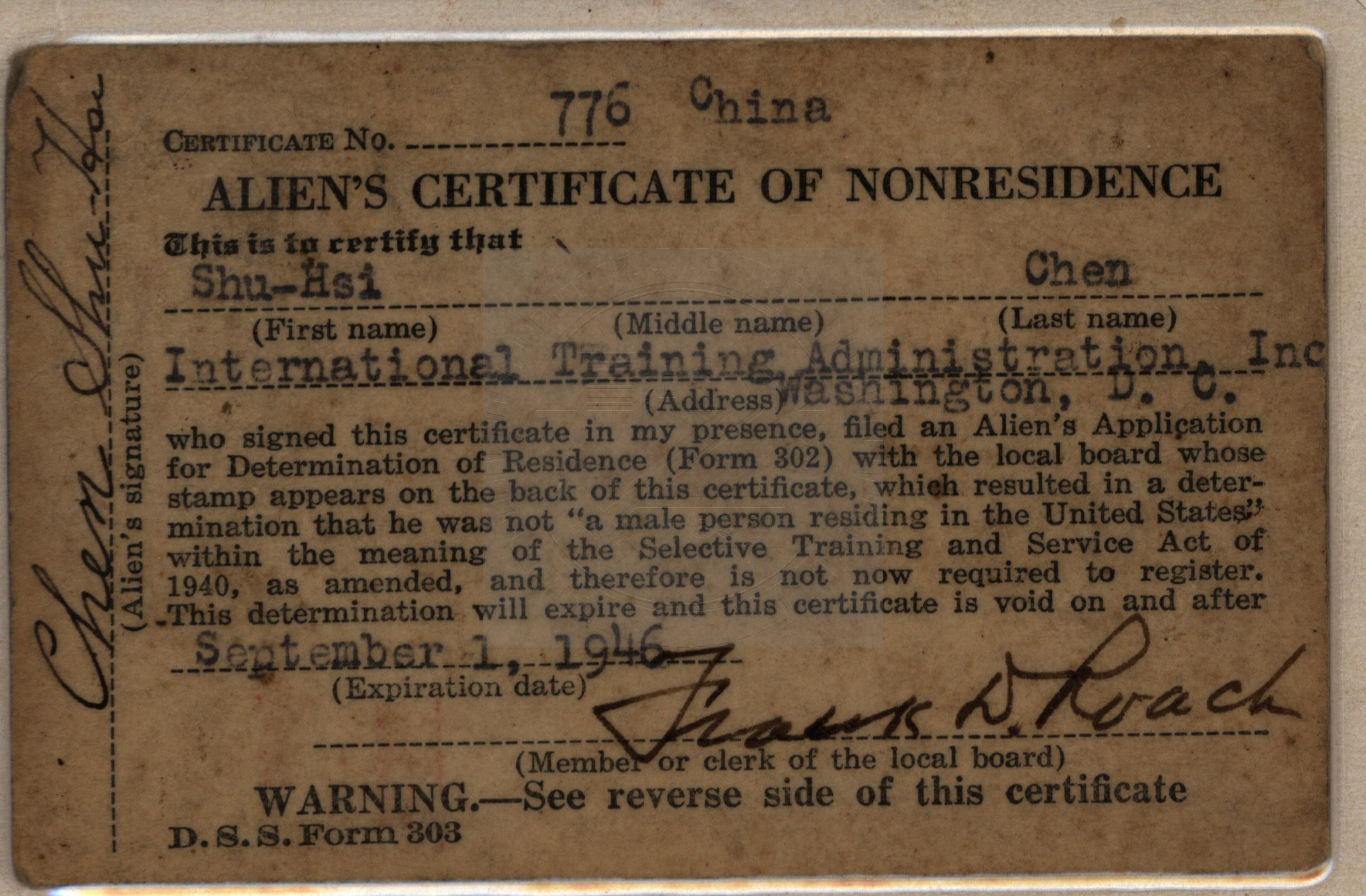 陳樹曦學長之"USA Alien’s Certificate of Nonresidence-Sh..