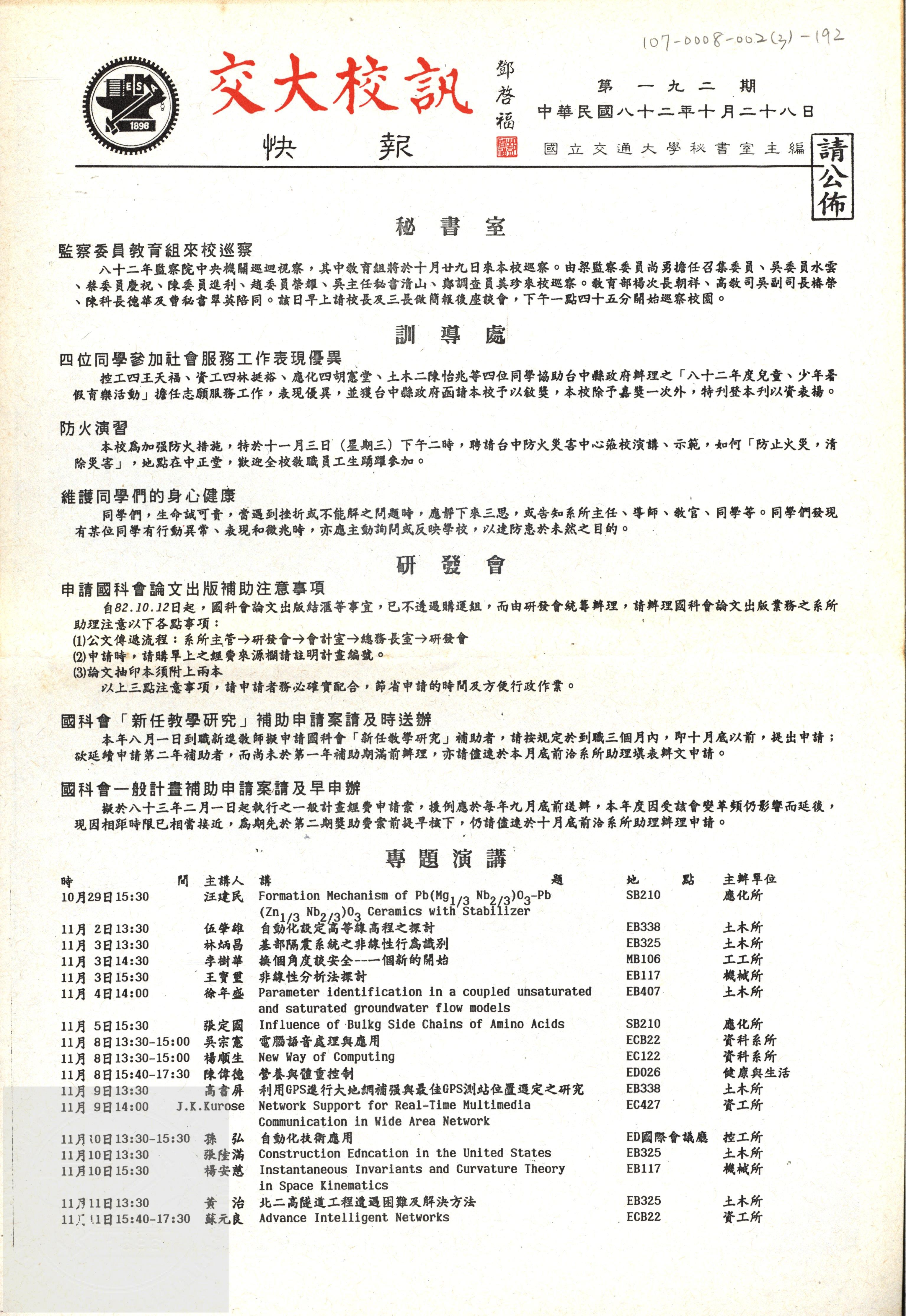典藏地:交大校區 說明:交大校訊快報 第一九二期,陳茂傑教授贈。 資料類型:書刊 典藏號:107-0008-002(3)-192 品名:交大校訊快報 第一九二期 作者:國立交通大學 年代:1993 出版者:國立交通大學秘書室編輯 數量:1件 稽核資料:1頁 版本: 印刷品 作品語文: 中文 關鍵詞:交大、校訊快報 權利聲明:國立陽明交通大學圖書館珍藏資料,如需引用,請註明來源。 取用權:開放