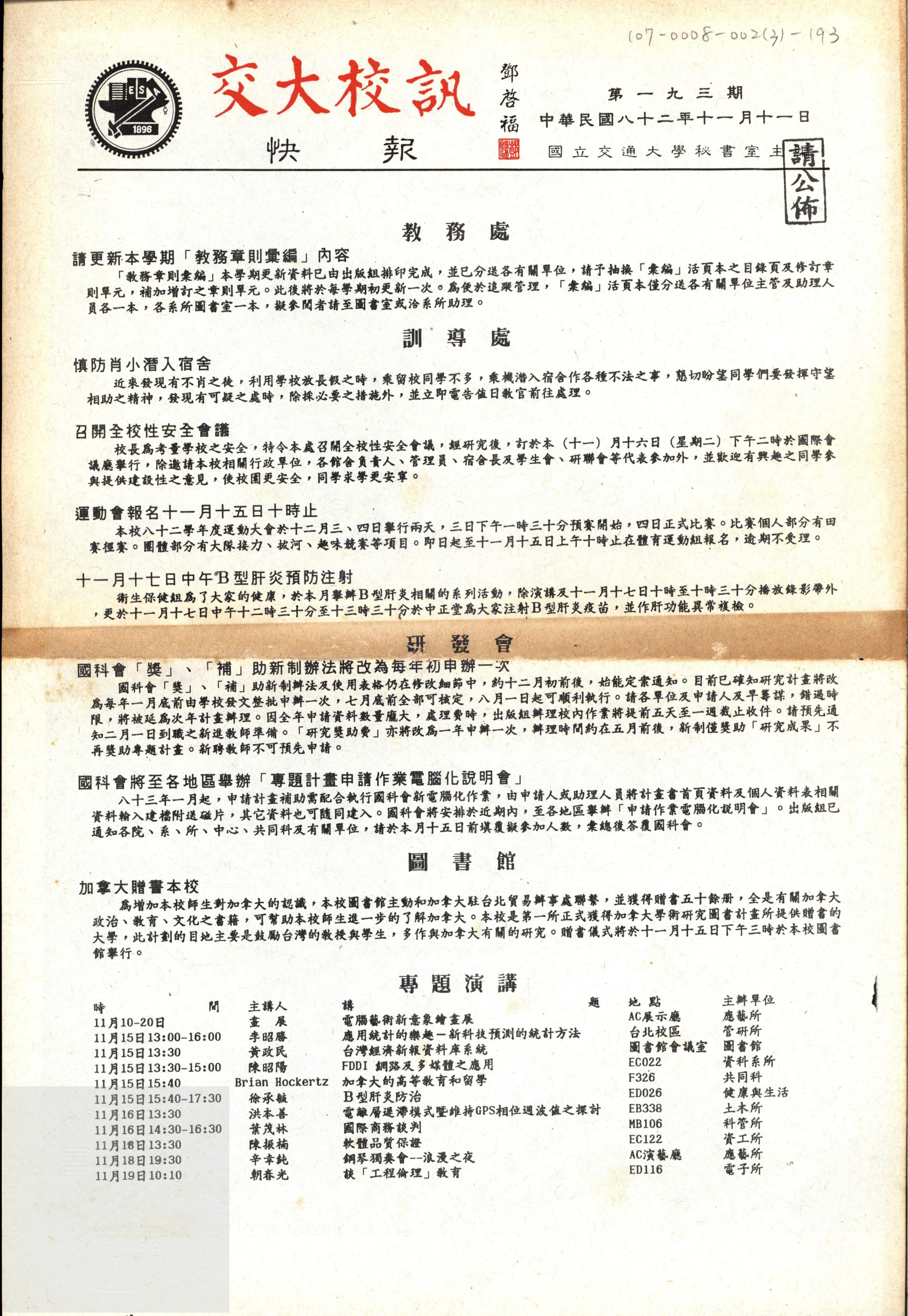 典藏地:交大校區 說明:交大校訊快報 第一九三期,陳茂傑教授贈。 資料類型:書刊 典藏號:107-0008-002(3)-193 品名:交大校訊快報 第一九三期 作者:國立交通大學 年代:1993 出版者:國立交通大學秘書室編輯 數量:1件 稽核資料:1頁 版本: 印刷品 作品語文: 中文 關鍵詞:交大、校訊快報 權利聲明:國立陽明交通大學圖書館珍藏資料,如需引用,請註明來源。 取用權:開放