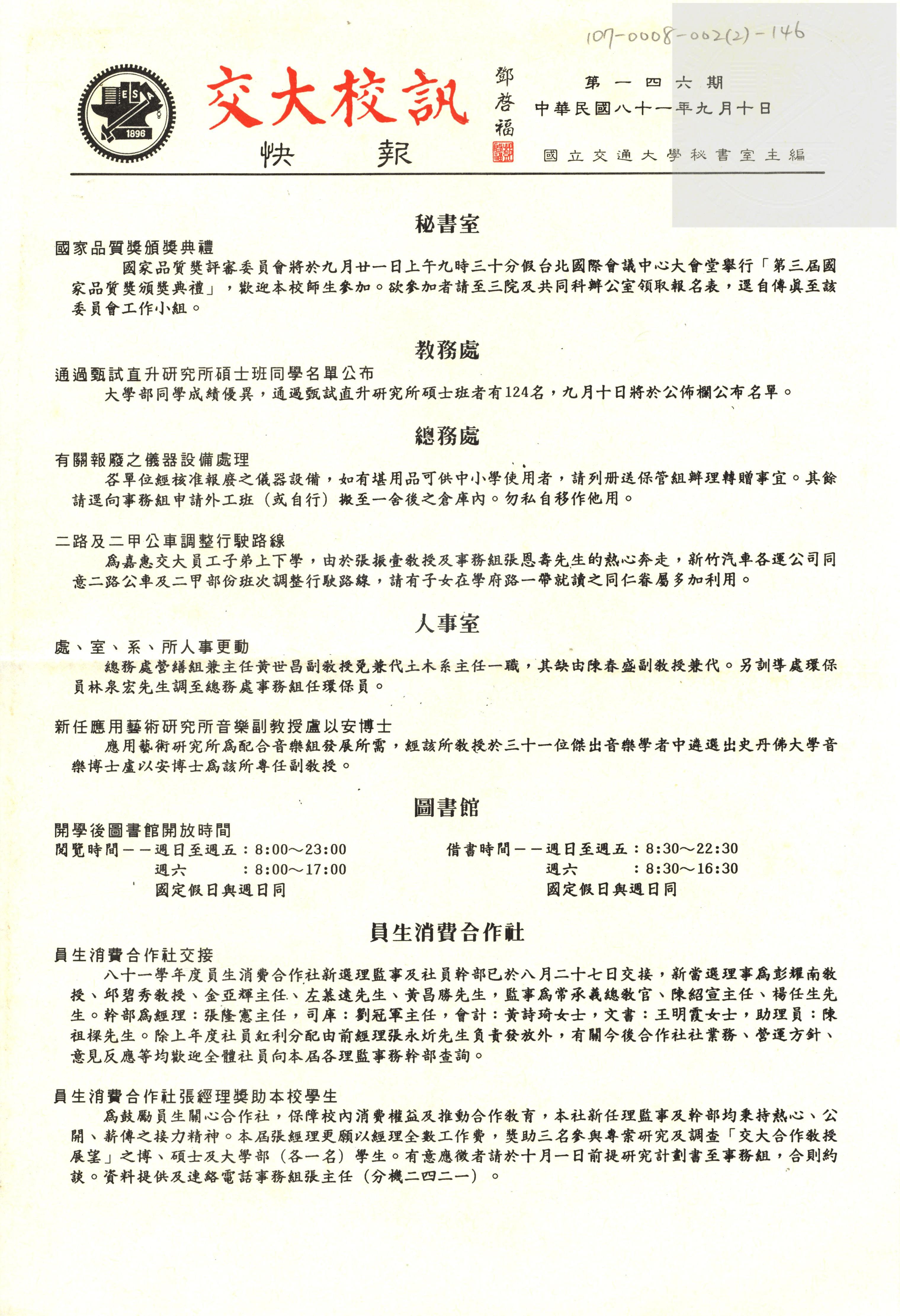 典藏地:交大校區 說明:交大校訊快報 第一四六期,陳茂傑教授贈。 資料類型:書刊 典藏號:107-0008-002(2)-146 品名:交大校訊快報 第一四六期 作者:國立交通大學 年代:1992 出版者:國立交通大學秘書室編輯 數量:1件 稽核資料:1頁 版本: 印刷品 作品語文: 中文 關鍵詞:交大、校訊快報 權利聲明:國立陽明交通大學圖書館珍藏資料,如需引用,請註明來源。 取用權:開放