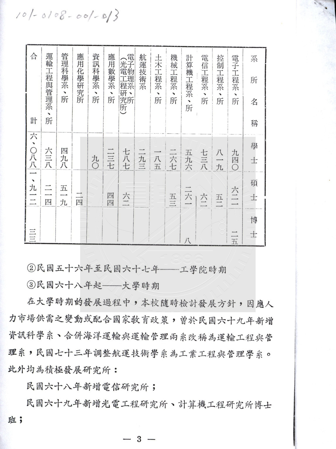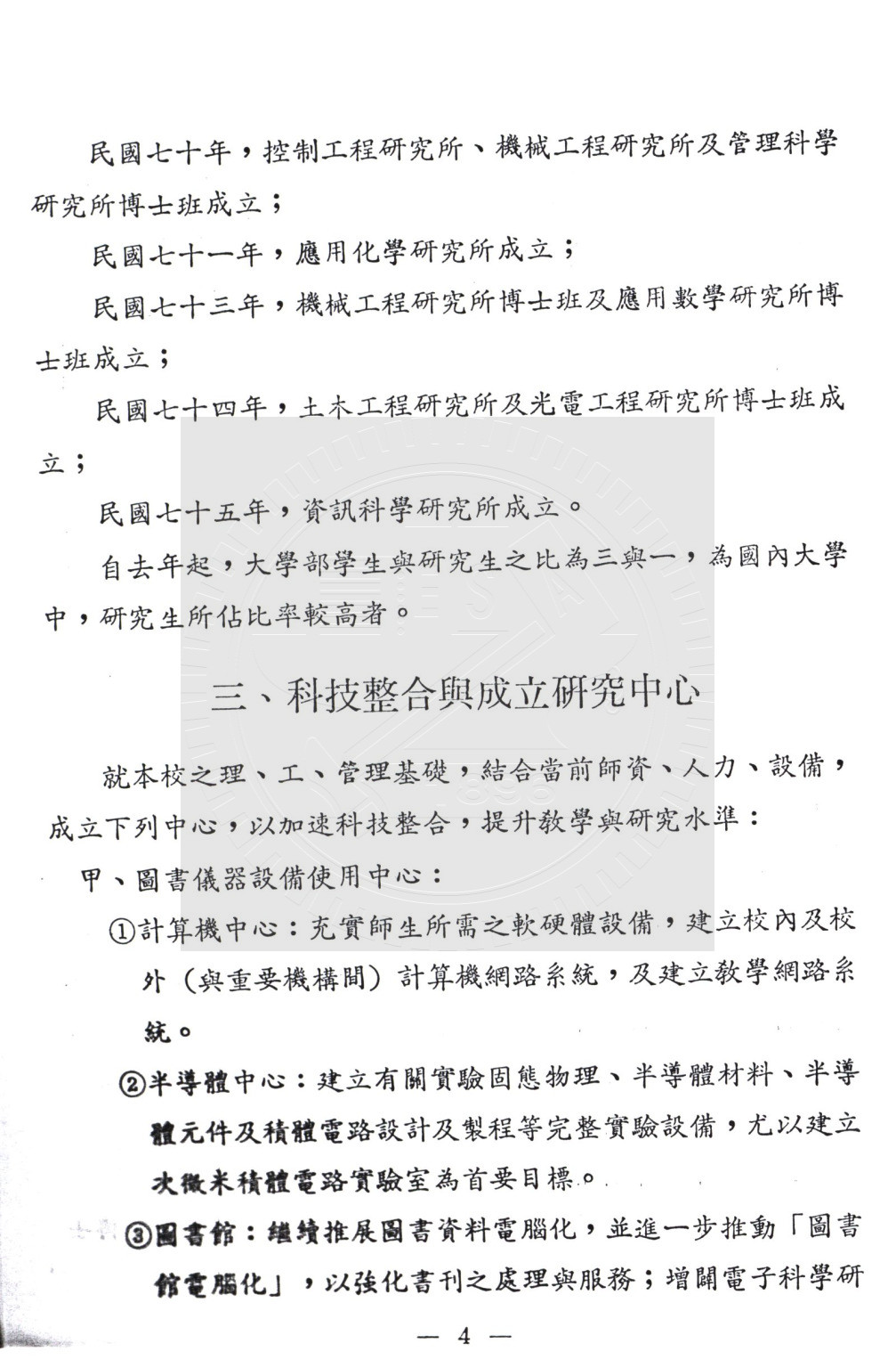典藏地:交大校區 說明:開創母校光輝的九十年代 (郭南宏),刊載於《友聲》第316期 第2至9頁。內容:積極發展研究所、成立研究中心、達成單一校區理想、人文藝術學院成立架構等。 資料類型:剪輯資料 典藏號:101-0108-001-013 品名:開創母校光輝的九十年代 作者:郭南宏 年代:1986 出版者:交大《友聲》 數量:1篇 稽核資料:8頁 版本: 影印稿 作品語文: 中文 關鍵詞:母校、光輝、九十年代 權利聲明:國立陽明交通大學圖書館珍藏資料,如需引用,請註明來源。 取用權:開放