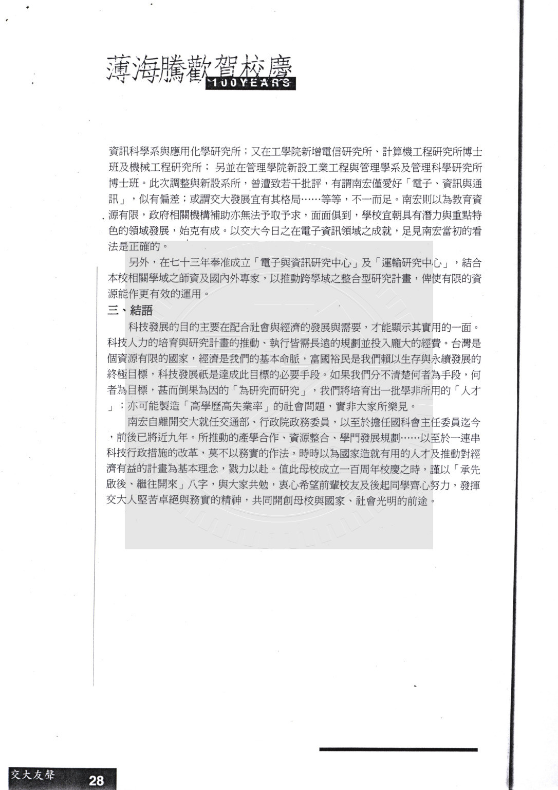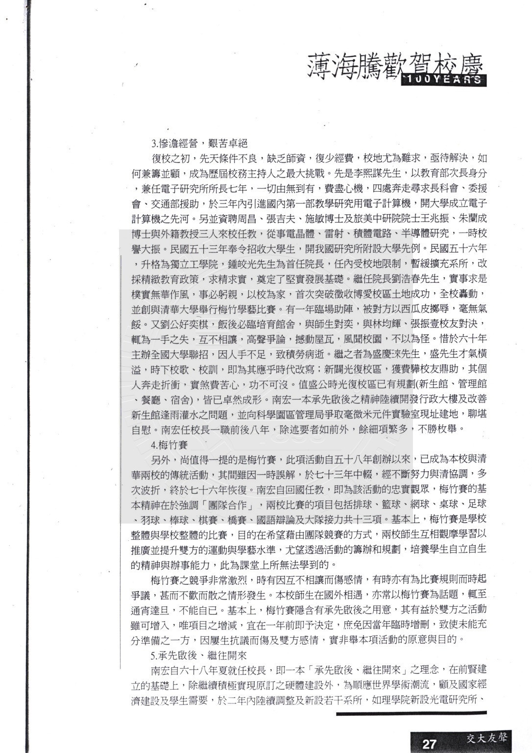 典藏地:交大校區 說明:母校成立一百周年感言 (郭南宏),刊載於《友聲》第355期 第26至28頁。 資料類型:剪輯資料 典藏號:101-0108-001-018 品名:母校成立一百周年感言 作者:郭南宏 年代:1996 出版者:交大《友聲》 數量:1篇 稽核資料:3頁 版本: 影印稿 作品語文: 中文 關鍵詞:母校、百周年 權利聲明:國立陽明交通大學圖書館珍藏資料,如需引用,請註明來源。 取用權:開放