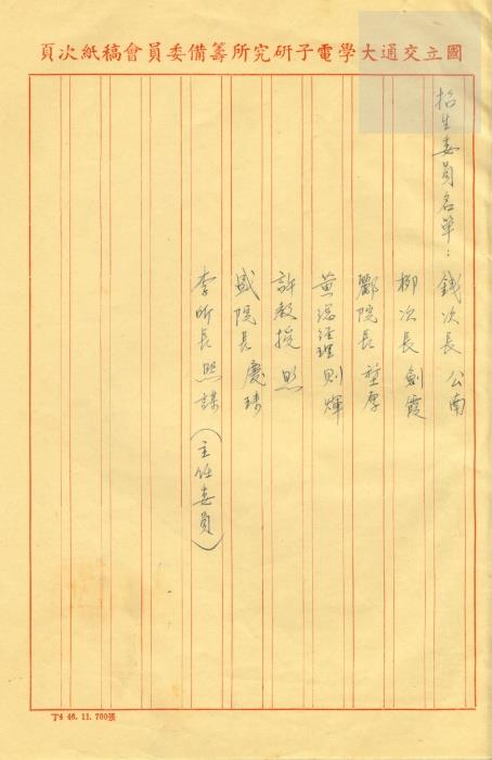 • 說明:國立交通大學電子研究所籌備委員會淩鴻勛(函)錢公南等七位先生–函請惠允任本校電子研究所四十七學年度招生委員。招生委員名單有:錢公南、柳劍霞、酈堃厚、黃煇、許照、盛慶琜、李熙謀。(46)交電籌總字第91號。