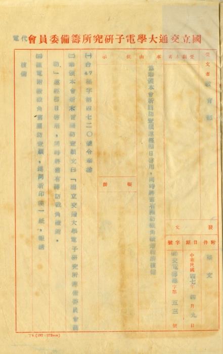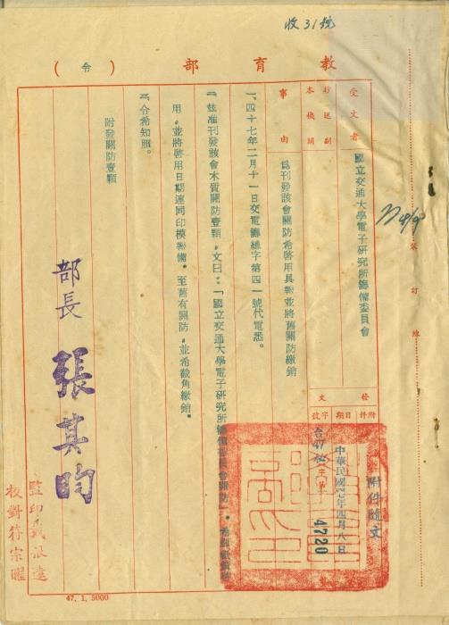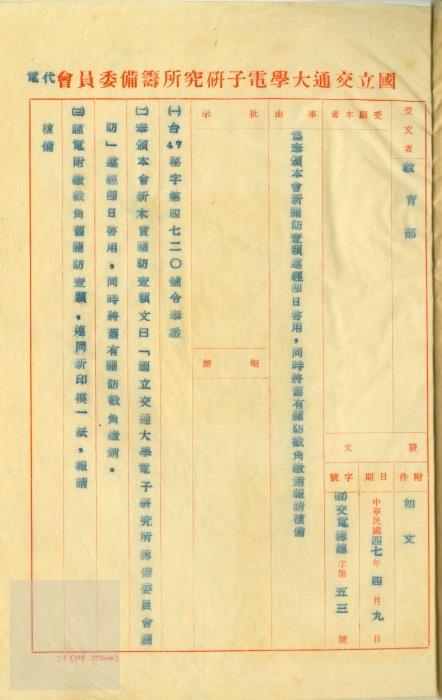 • 關鍵詞:交通大學復校時期公文檔案電子研究所籌備委員會教育部關防