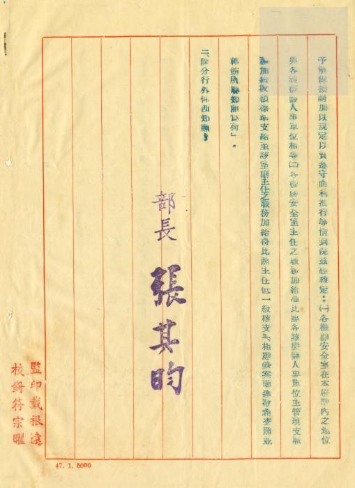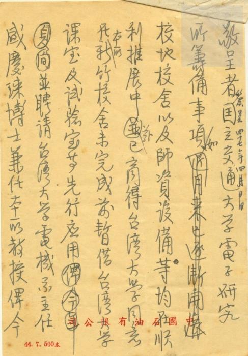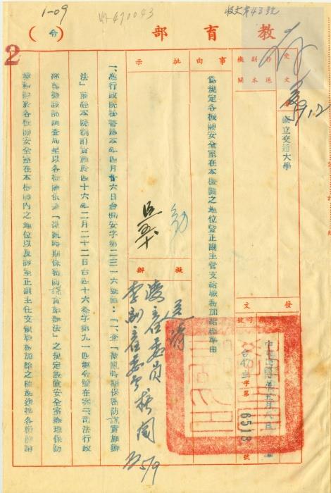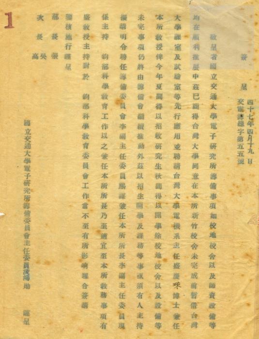 典藏地:交大校區 說明:教育部(令)國立交通大學–為規定各機關安全室在本機關之地位暨正副主管支給職務加給標準由。台(47)主字第6518號。附件為國立交通大學電子研究所籌備委員會主任委員淩鴻勛給教育部的簽呈,擬請明令聘任籌備委員會副主任委員李熙謀兼任電子研究所所長。 資料類型:公文 典藏號:301-0001-0001-020 品名:教育部(令)國立交通大學 作者:教育部 年代:1958 出版者:- 數量:1件 稽核資料:7頁 版本: 手稿、打字稿 作品語文: 中文 關鍵詞:交通大學、復校時期、公文檔案、電子研究所籌備委員會、教育部、淩鴻勛、李熙謀 權利聲明:國立陽明交通大學圖書館珍藏資料,如需引用,請註明來源。 取用權:開放