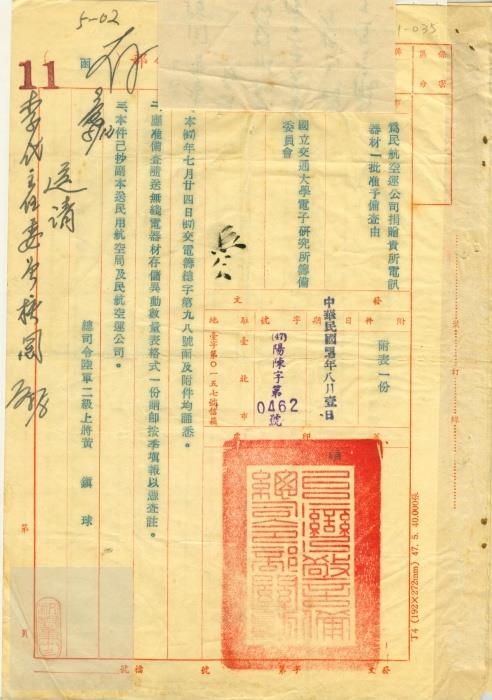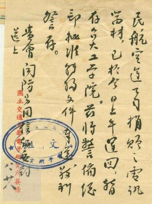 典藏地:交大校區 說明:臺灣警備總司令部(函)國立交通大學電子研究所籌備委員會–為民航空運公司捐贈貴所電訊器材一批准予備查由。(47)陽陳字第0462號。 資料類型:公文 典藏號:301-0001-0001-035 品名:臺灣警備總司令部(函)國立交通大學電子研究所籌備委員會 作者:臺灣警備總司令部 年代:1958 出版者:- 數量:1件 稽核資料:4頁 版本: 手稿、打字稿、油印稿 作品語文: 中文 關鍵詞:交通大學、復校時期、公文檔案、臺灣警備總司令部、電子研究所籌備委員會 權利聲明:國立陽明交通大學圖書館珍藏資料,如需引用,請註明來源。 取用權:開放