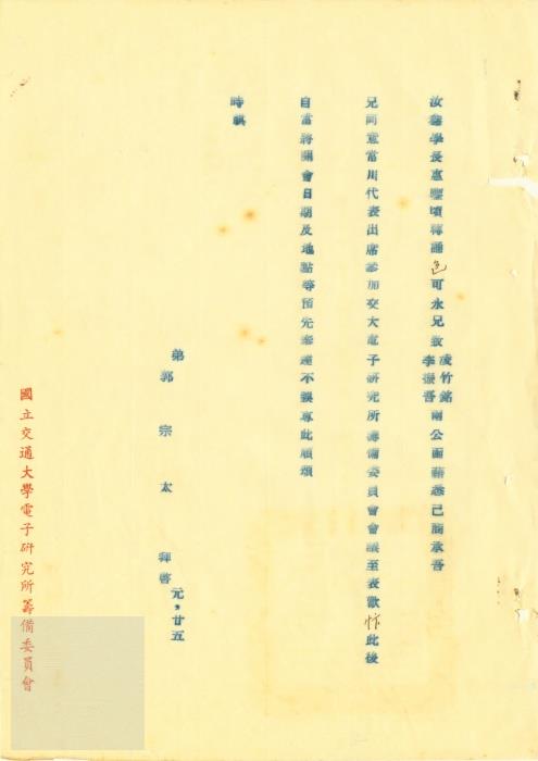 典藏地:交大校區 說明:郭宗太(函)俞汝鑫先生–兄同意常川代表出席参加交大電子研究所籌備委員會會議。(47)交電籌總字第32號。 資料類型:公文 典藏號:301-0001-0001-046 品名:郭宗太(函)俞汝鑫先生 作者:郭宗太 年代:1958 出版者:- 數量:1件 稽核資料:3頁 版本: 打字稿、手稿 作品語文: 中文 關鍵詞:交通大學、復校時期、公文檔案、電子研究所籌備委員會、郭宗太、俞汝鑫 權利聲明:國立陽明交通大學圖書館珍藏資料,如需引用,請註明來源。 取用權:開放