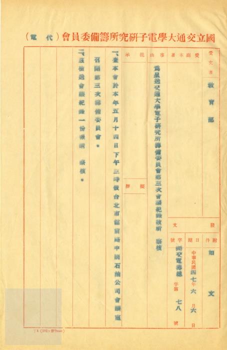 典藏地:交大校區 說明:國立交通大學電子研究所籌備委員會(代電)教育部–為呈送交通大學電子研究所籌備委員會第三次會議紀錄。(47)交電籌總字第78號。 資料類型:公文 典藏號:301-0001-0001-062 品名:國立交通大學電子研究所籌備委員會(代電)教育部 作者:國立交通大學電子研究所籌備委員會 年代:1958 出版者:- 數量:1件 稽核資料:5頁 版本: 打字稿、手稿 作品語文: 中文 關鍵詞:交通大學、復校時期、公文檔案、電子研究所籌備委員會 權利聲明:國立陽明交通大學圖書館珍藏資料,如需引用,請註明來源。 取用權:開放