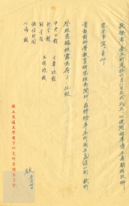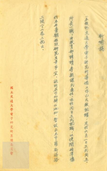 典藏地:交大校區 說明:國立交通大學電子研究所籌備委員會發給中央日報等媒體新聞稿–為交大電子研究所定於本年六月一日成立由主任委員李熙謀兼任。發文對象有中央日報、新生報、聯合報、徵信新聞、公論報、大華晚報、民族晚報等。(47)交電籌總字第81號。 資料類型:公文 典藏號:301-0001-0001-065 品名:國立交通大學電子研究所籌備委員會發給中央日報等媒體新聞稿 作者:國立交通大學電子研究所籌備委員會 年代:1958 出版者:- 數量:1件 稽核資料:3頁 版本: 手稿 作品語文: 中文 關鍵詞:交通大學、復校時期、公文檔案、電子研究所、李熙謀、中央日報、新生報、聯合報、徵信新聞、公論報、大華晚報、民族晚報 權利聲明:國立陽明交通大學圖書館珍藏資料,如需引用,請註明來源。 取用權:開放