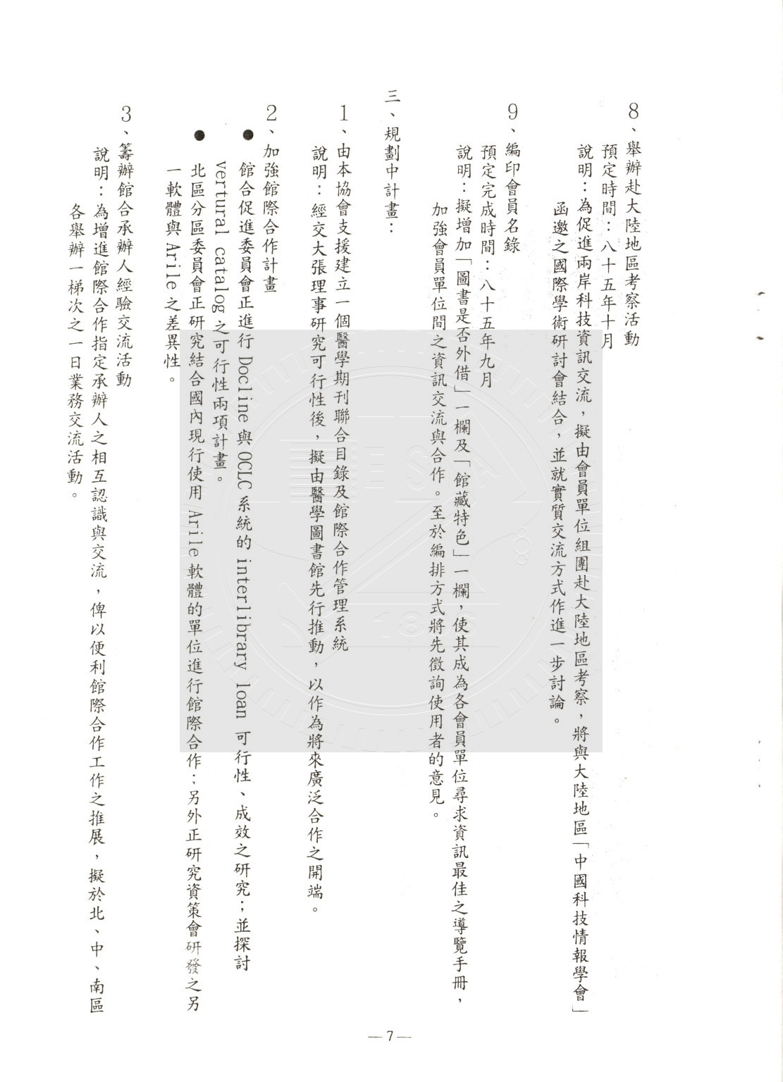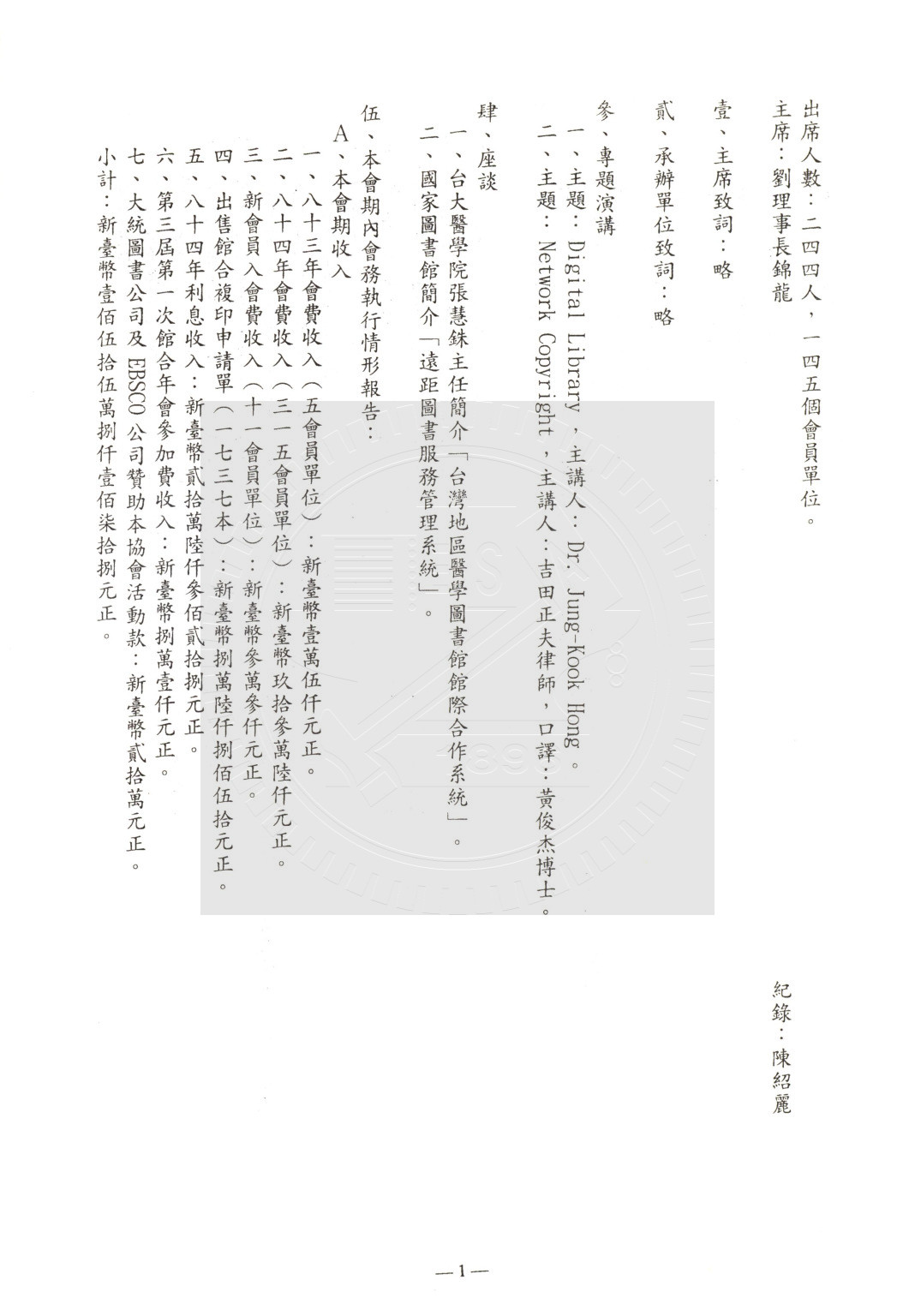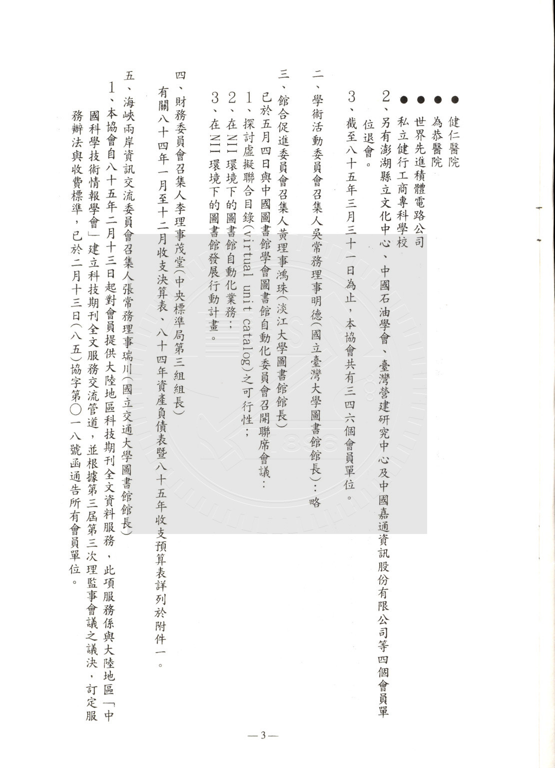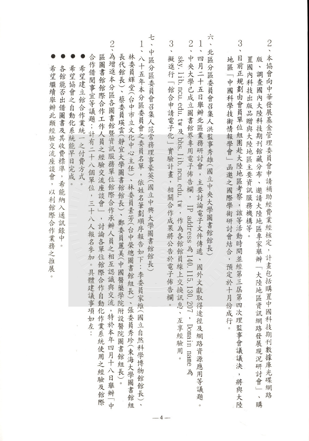 典藏地:交大校區 說明:中華民國科技館際合作協會第三屆第二次會員大會會議紀錄。說明:1、時間:85年5月9日。2、地點:交通大學國際會議廳。3、主辦單位:中華民國科技館際合作協會。4、承辦單位:交通大學(圖書館)。 資料類型:會議資料 典藏號:105-0001-003-002 品名:中華民國科技館際合作協會第三屆第二次會員大會會議紀錄 作者:- 年代:1996 出版者:中華民國科技館際合作協會 數量:1冊 稽核資料:13頁 版本: 影印稿 作品語文: 中文 關鍵詞:科技館際合作協會、會員大會、會議紀錄 權利聲明:國立陽明交通大學圖書館珍藏資料,如需引用,請註明來源。 取用權:開放