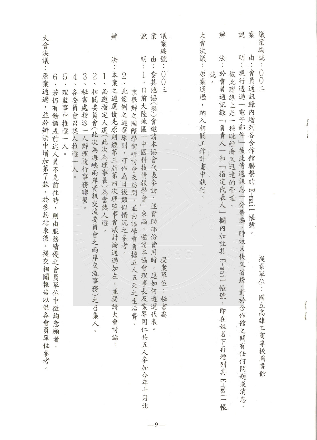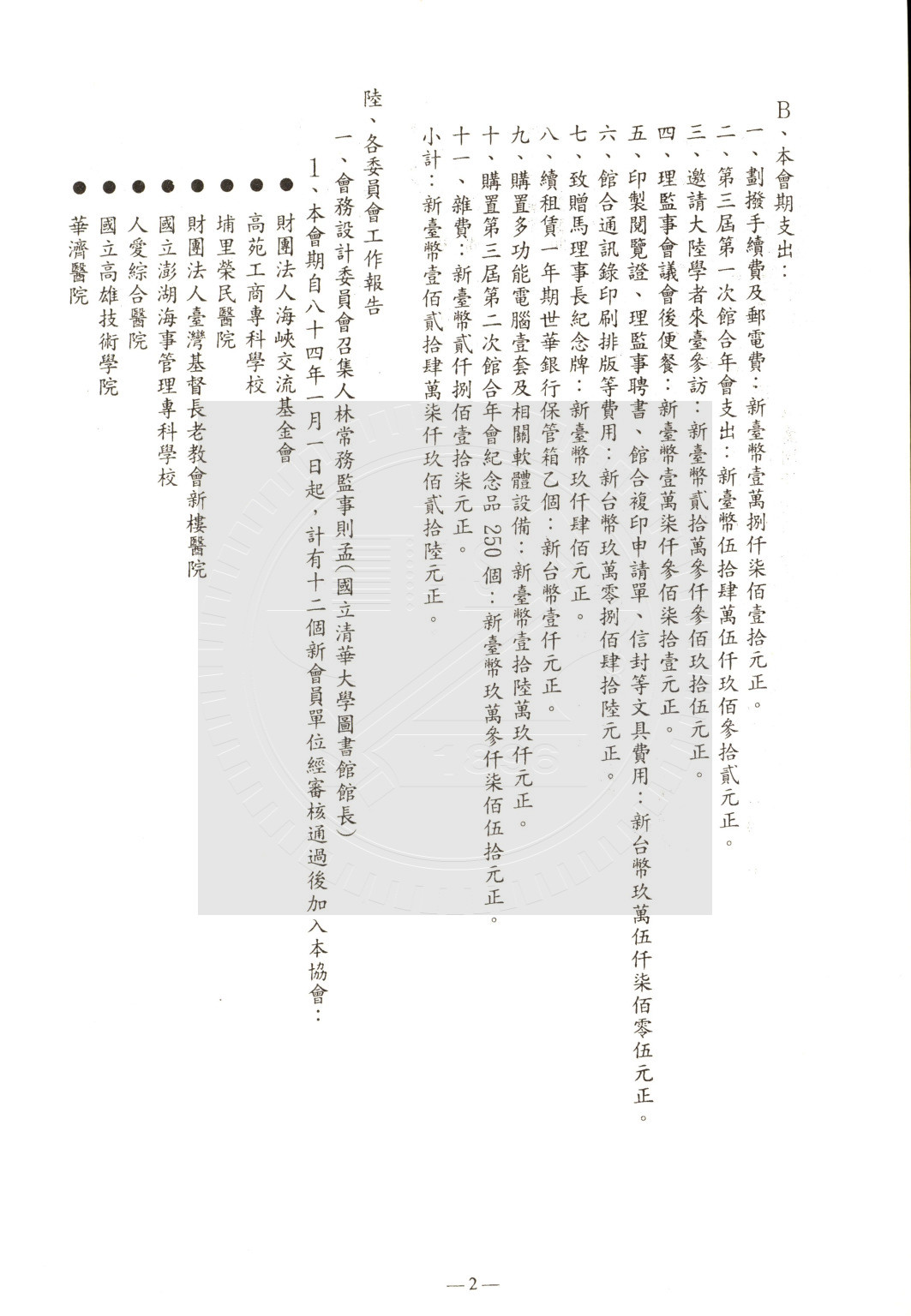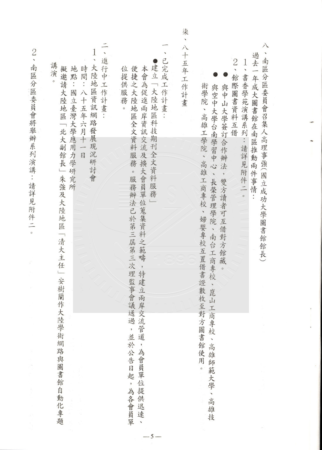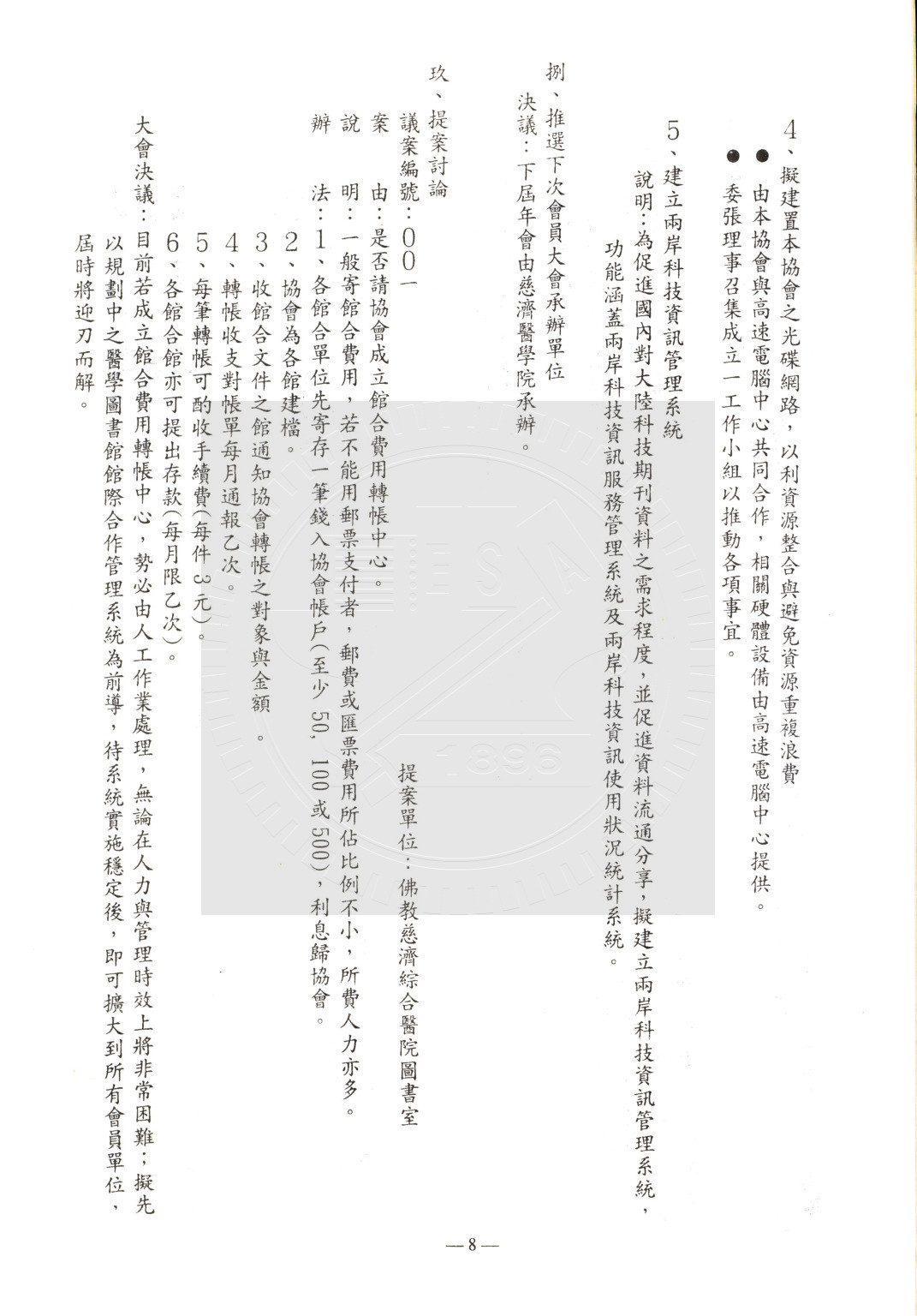 典藏地:交大校區 說明:中華民國科技館際合作協會第三屆第二次會員大會會議紀錄。說明:1、時間:85年5月9日。2、地點:交通大學國際會議廳。3、主辦單位:中華民國科技館際合作協會。4、承辦單位:交通大學(圖書館)。 資料類型:會議資料 典藏號:105-0001-003-002 品名:中華民國科技館際合作協會第三屆第二次會員大會會議紀錄 作者:- 年代:1996 出版者:中華民國科技館際合作協會 數量:1冊 稽核資料:13頁 版本: 影印稿 作品語文: 中文 關鍵詞:科技館際合作協會、會員大會、會議紀錄 權利聲明:國立陽明交通大學圖書館珍藏資料,如需引用,請註明來源。 取用權:開放