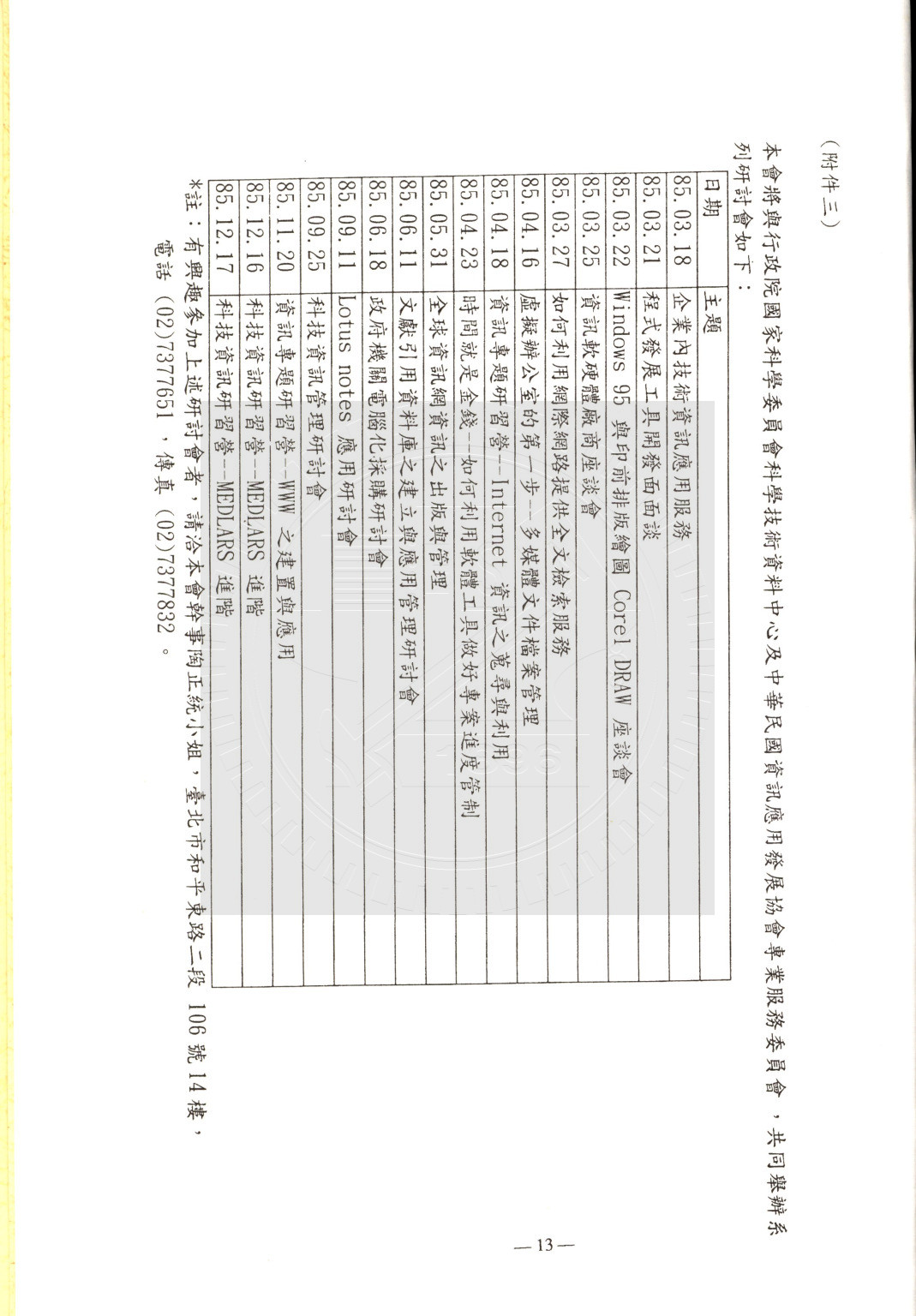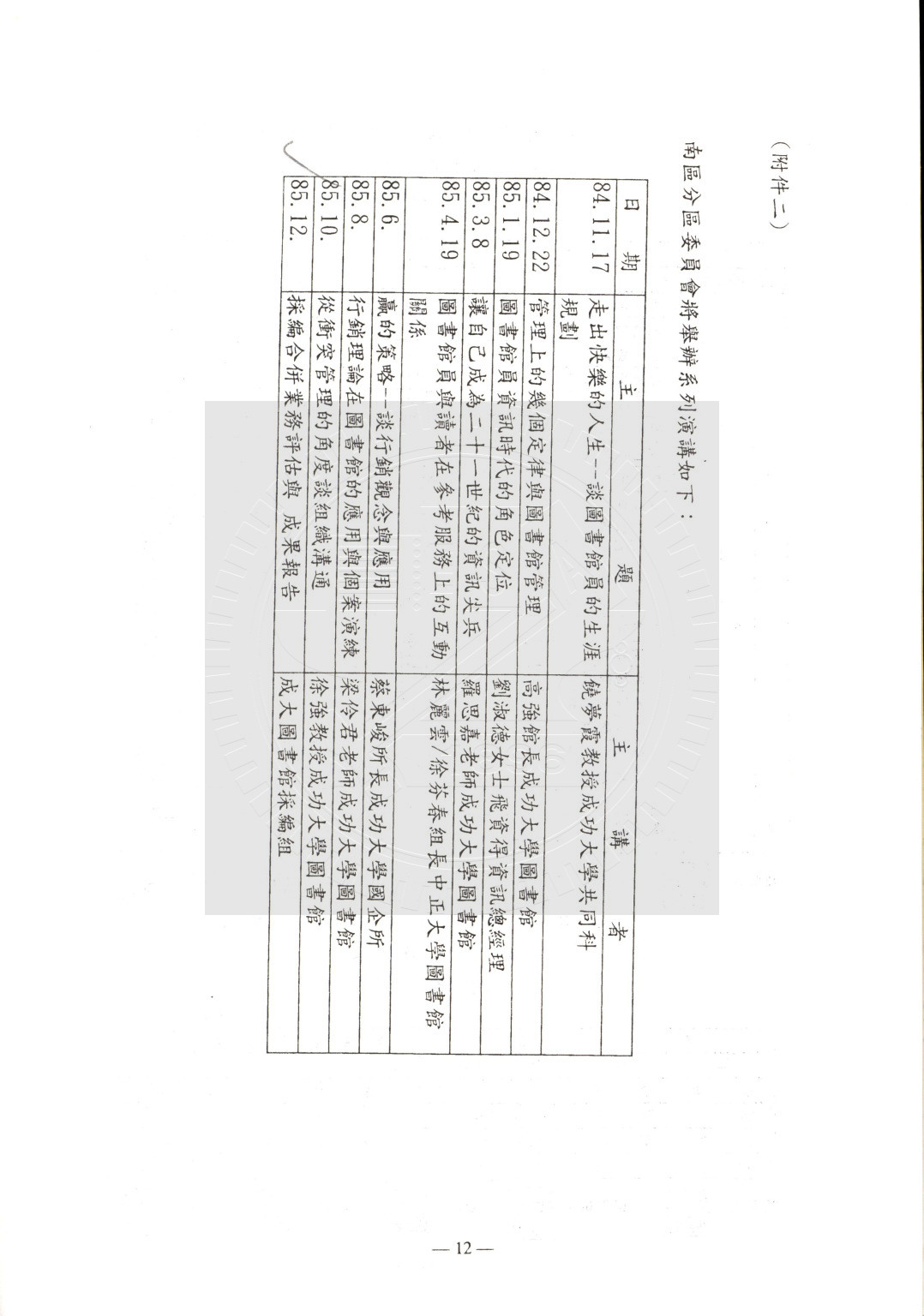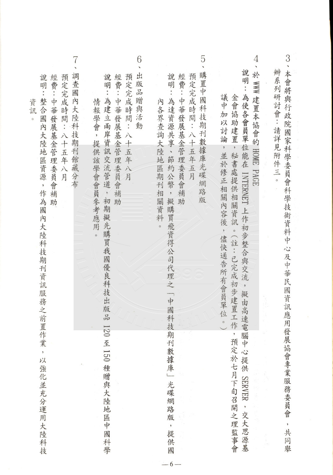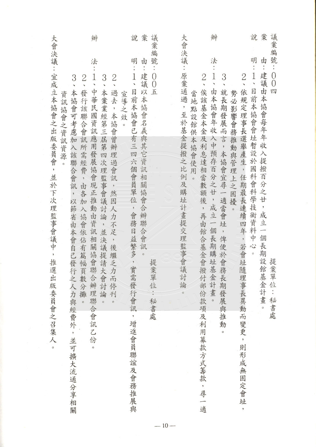 典藏地:交大校區 說明:中華民國科技館際合作協會第三屆第二次會員大會會議紀錄。說明:1、時間:85年5月9日。2、地點:交通大學國際會議廳。3、主辦單位:中華民國科技館際合作協會。4、承辦單位:交通大學(圖書館)。 資料類型:會議資料 典藏號:105-0001-003-002 品名:中華民國科技館際合作協會第三屆第二次會員大會會議紀錄 作者:- 年代:1996 出版者:中華民國科技館際合作協會 數量:1冊 稽核資料:13頁 版本: 影印稿 作品語文: 中文 關鍵詞:科技館際合作協會、會員大會、會議紀錄 權利聲明:國立陽明交通大學圖書館珍藏資料,如需引用,請註明來源。 取用權:開放