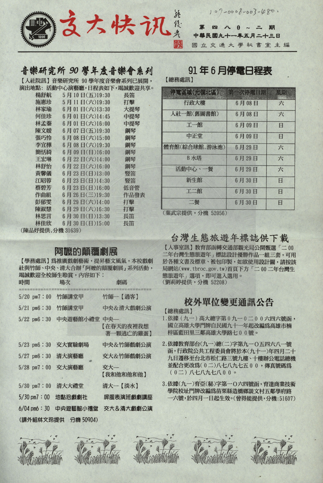 典藏地:交大校區 說明:交大快訊 第四八O期 資料類型:書刊 典藏號:107-0008-003-480 品名:交大快訊 第四八O期 作者:國立交通大學秘書室編輯 年代:2002 出版者:國立交通大學 數量:1件 稽核資料:2頁 版本: 印刷品 作品語文: 中文 關鍵詞:交大、快訊 權利聲明:國立陽明交通大學圖書館珍藏資料,如需引用,請註明來源。 取用權:開放