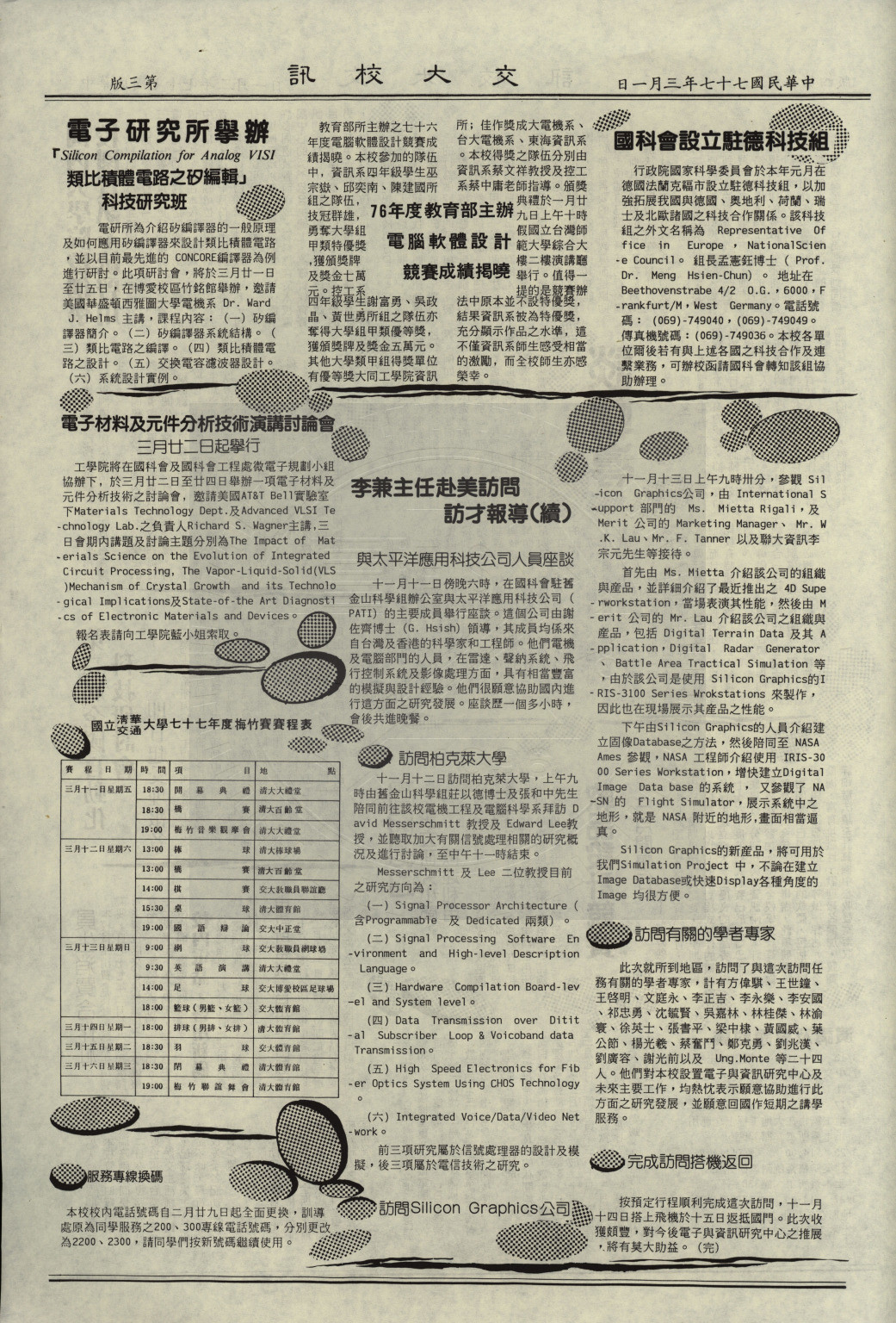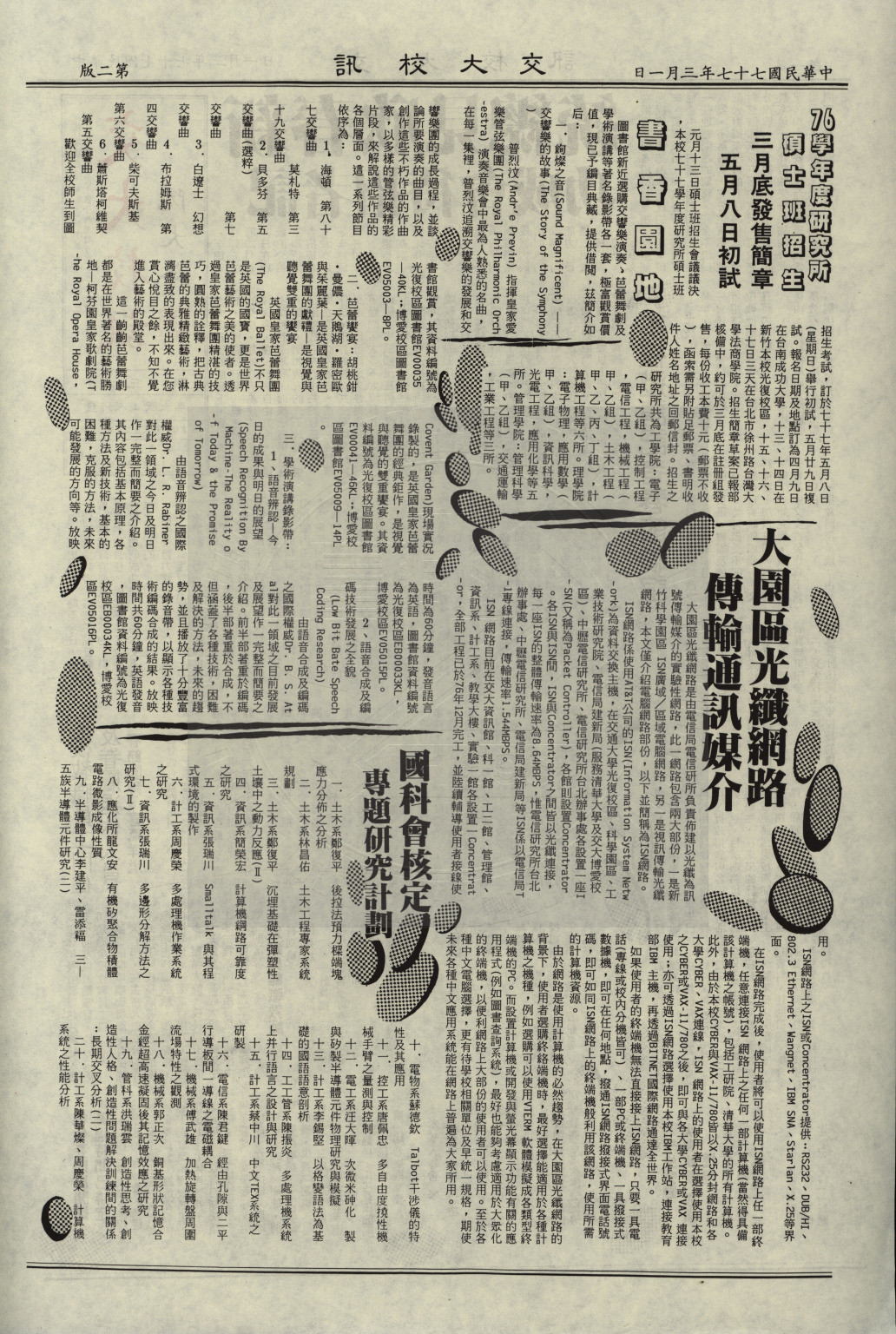 典藏地:交大校區 說明:交大校訊 第三期,内容含:本校邀請記者春節聯誼;國內大學院校創舉 校園資訊系統啟用等。 資料類型:書刊 典藏號:107-0008-005-003 品名:交大校訊 第三期 作者:國立交通大學秘書室編輯 年代:1988 出版者:國立交通大學 數量:1件 稽核資料:四版(4頁) 版本: 印刷品 作品語文: 中文 關鍵詞:交大、校訊 權利聲明:國立陽明交通大學圖書館珍藏資料,如需引用,請註明來源。 取用權:開放