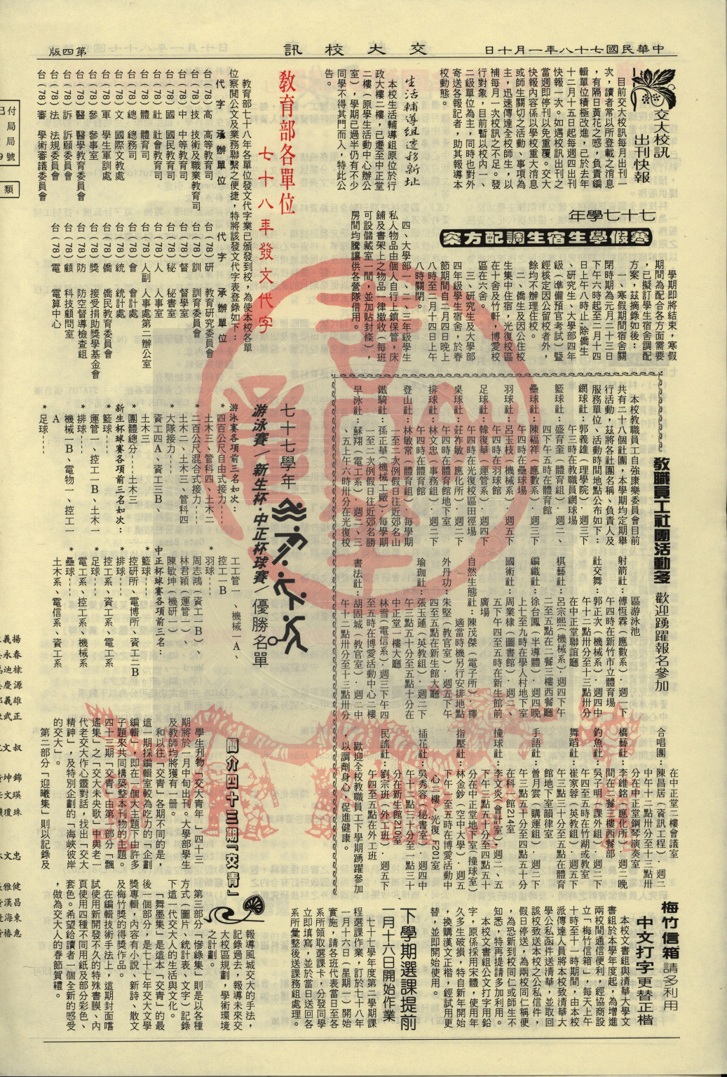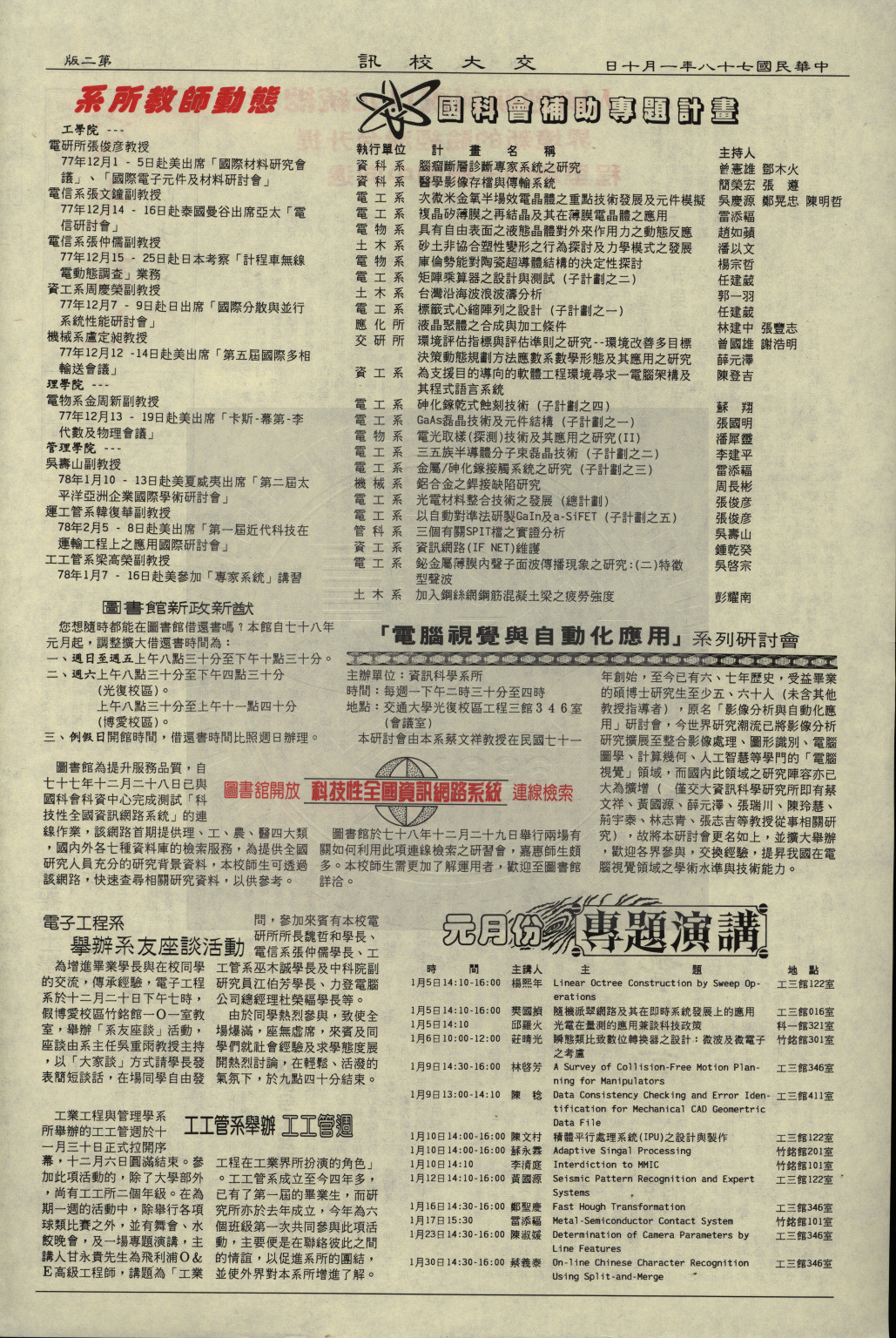 典藏地:交大校區 說明:交大校訊 第十二期,内容含:國家級次微米實驗室七十八年元月破土興建;圖書館開放「科技性全國資訊網路系統」連線檢索等。 資料類型:書刊 典藏號:107-0008-005-012 品名:交大校訊 第十二期 作者:國立交通大學秘書室編輯 年代:1989 出版者:國立交通大學 數量:1件 稽核資料:四版(4頁) 版本: 印刷品 作品語文: 中文 關鍵詞:交大、校訊 權利聲明:國立陽明交通大學圖書館珍藏資料,如需引用,請註明來源。 取用權:開放