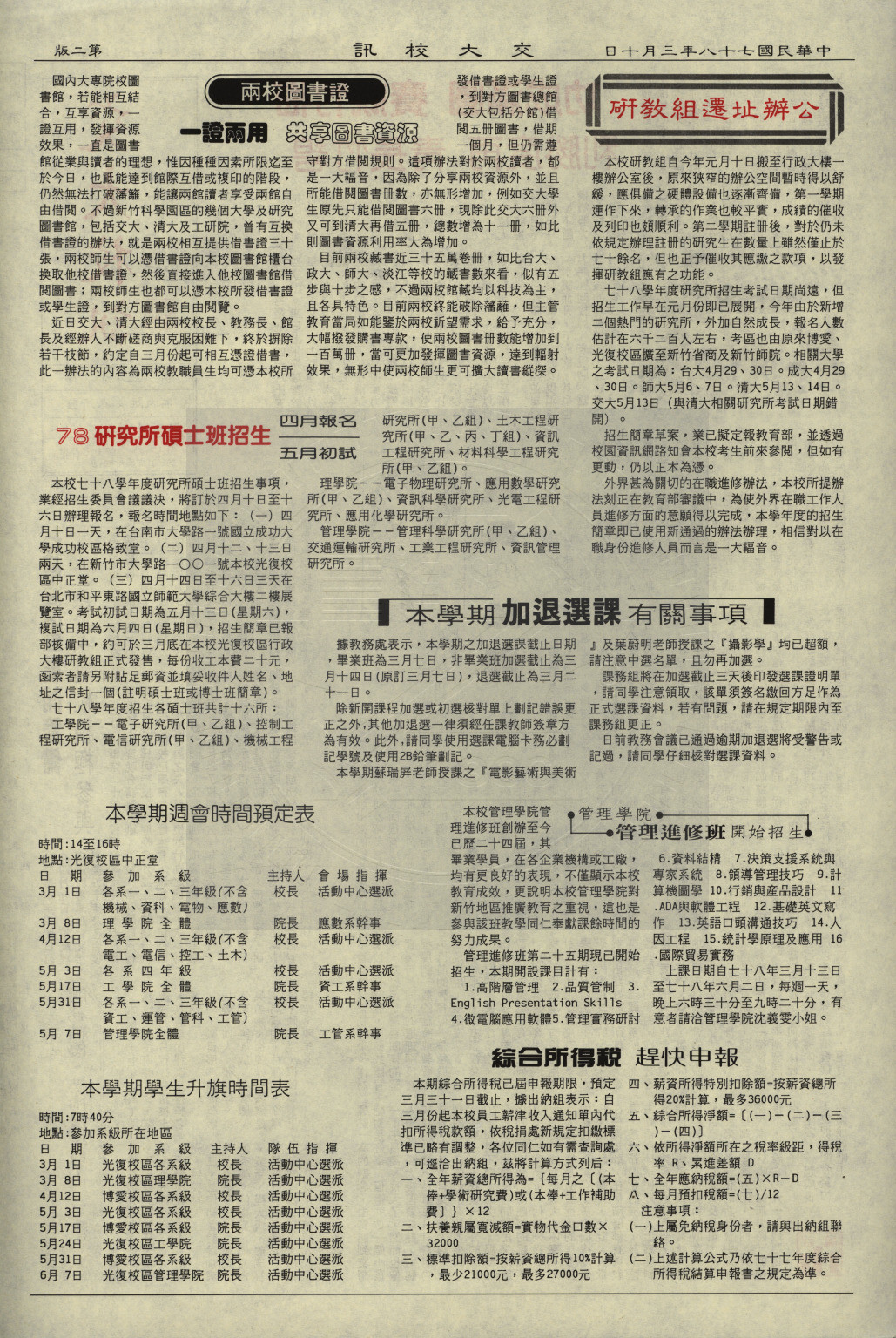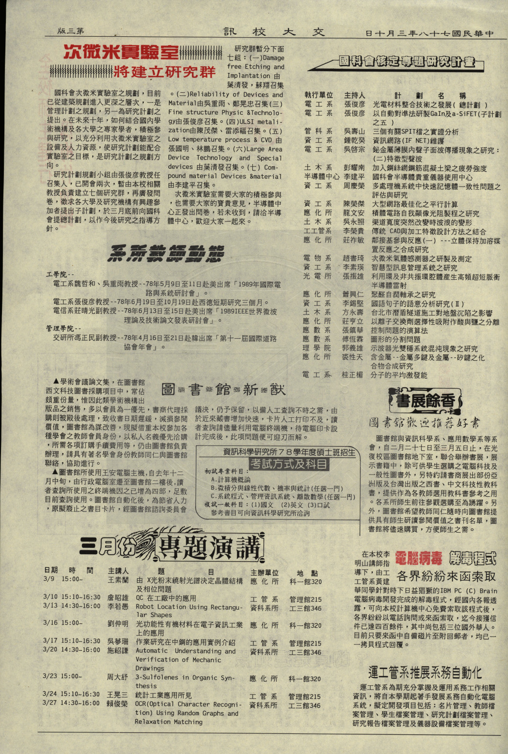 典藏地:交大校區 說明:交大校訊 第十三期,内容含:成長與成熟(阮大年);清、交兩校圖書證 一證兩用;次微米實驗室將建立研究群等。 資料類型:書刊 典藏號:107-0008-005-013 品名:交大校訊 第十三期 作者:國立交通大學秘書室編輯 年代:1989 出版者:國立交通大學 數量:1件 稽核資料:四版(4頁) 版本: 印刷品 作品語文: 中文 關鍵詞:交大、校訊 權利聲明:國立陽明交通大學圖書館珍藏資料,如需引用,請註明來源。 取用權:開放