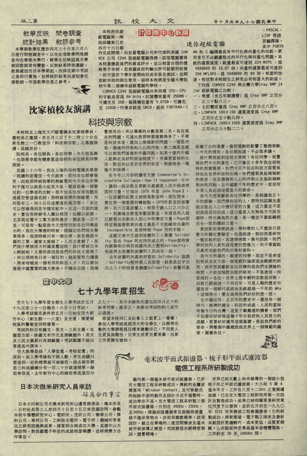 典藏地:交大校區 說明:交大校訊 第 二十四期,内容含:學生自治幹部會議 校長親臨主持;毫米波平面式振盪器、梳子形平面式濾波器 電信工程系所研製成功;新社團-電影研習社等。 資料類型:書刊 典藏號:107-0008-005-024 品名:交大校訊 第 二十四期 作者:國立交通大學秘書室編輯 年代:1990 出版者:國立交通大學 數量:1件 稽核資料:四版(4頁) 版本: 印刷品 作品語文: 中文 關鍵詞:交大、校訊 權利聲明:國立陽明交通大學圖書館珍藏資料,如需引用,請註明來源。 取用權:開放