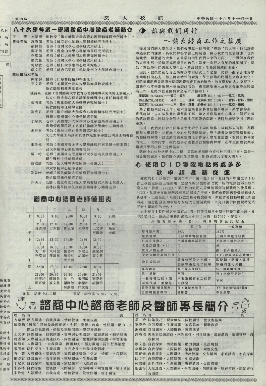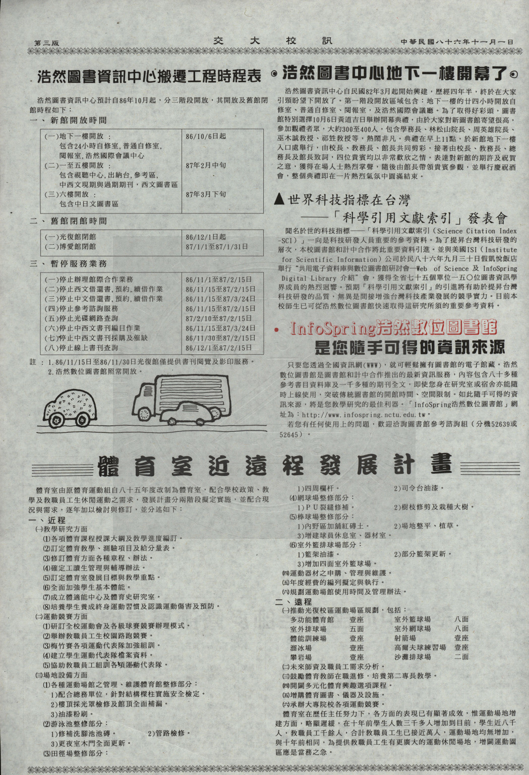 典藏地:交大校區 說明:交大校訊 第八十八期,內容含:從學習中成長(劉英達);本校與加拿大亞伯他大學簽訂學術交流協議書;浩然圖書資訊中心地下一樓開幕了;體育室近遠程發展計畫等。 資料類型:書刊 典藏號:107-0008-005-088 品名:交大校訊 第八十八期 作者:國立交通大學秘書室編輯 年代:1997 出版者:國立交通大學 數量:1件 稽核資料:四版(4頁) 版本: 印刷品 作品語文: 中文 關鍵詞:交大、校訊 權利聲明:國立陽明交通大學圖書館珍藏資料,如需引用,請註明來源。 取用權:開放